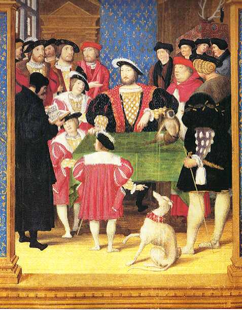 Peinture ornant le frontispice du manuscrit de la traduction de Diodore de Sicile par Antoine Macault, ayant fait partie du Cabinet du Roi, vers 1530. (Chantilly, Musée Condé)