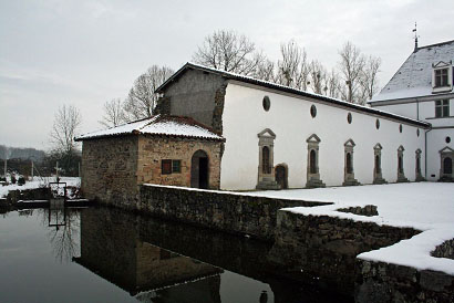 - Le bâtiment central prolonge au 1er étage les appartements tandis qu'au rez-de-chaussée se trouve la salle des rocailles et la chapelle.