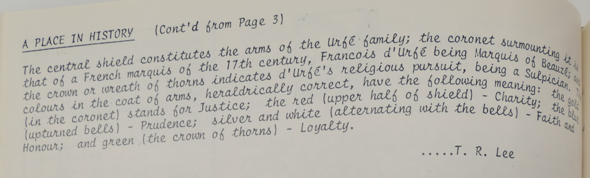 The central shield constitutes the arms of the Urfé family; the coronet surmorunting it is that of a French marquis of the 17th century, Francois d'Urfé being Marquis of Beauzé [Baugé] and the crown or wreath of thorns indicates d'Urfé's religious pursuit, being a Sulpician. The colours in the coat of arms, heraldrically correct, have the following meaning: the gold (in the coronet) stands for Justice; the red (upper half of shield) - Charity; the blue (upturned bells) - Prudence; silver and white (alternating with the the bells) - Faith and Honour; and green (the crown of thorns) - Loyalty.