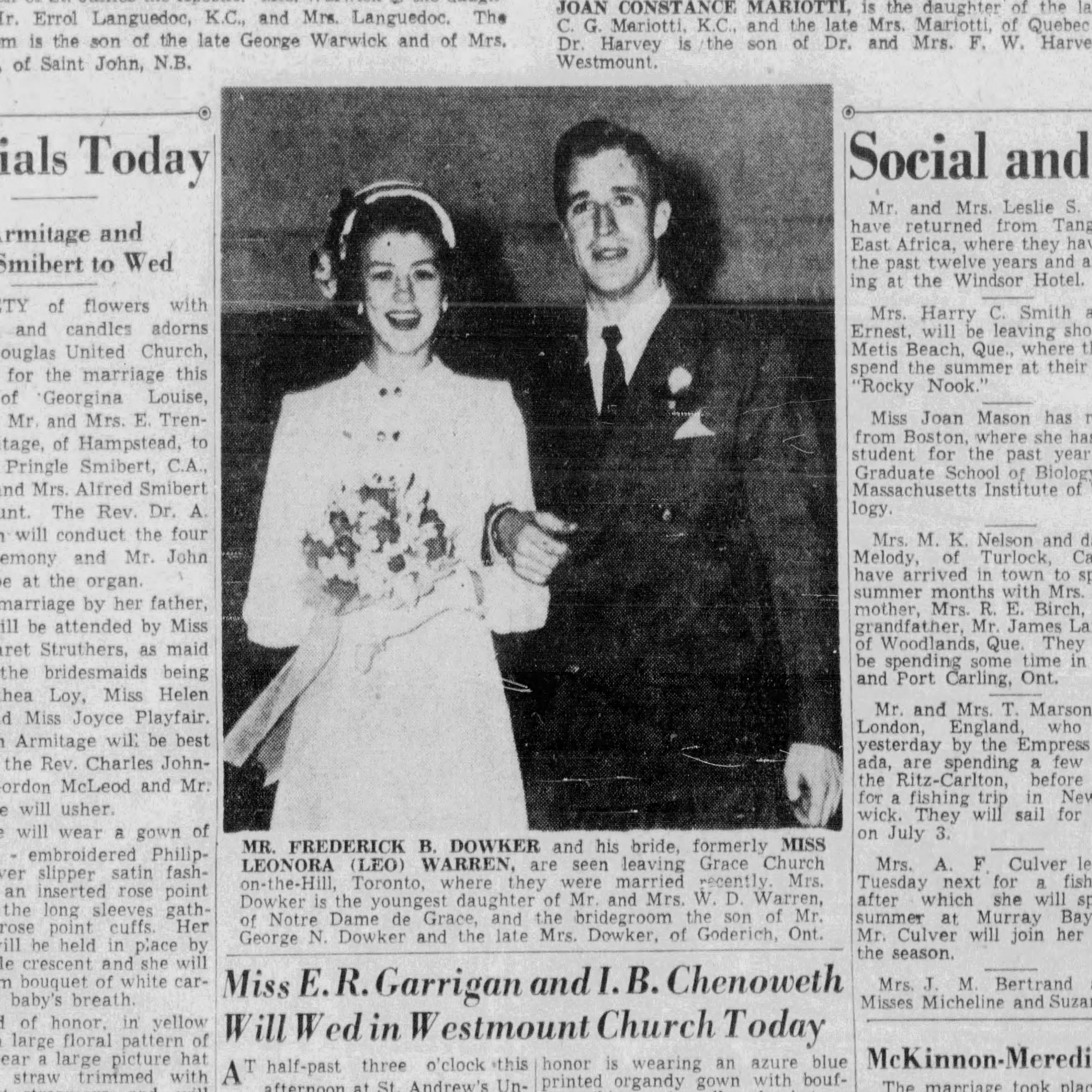 Marriage of Frederick B. Dowker and Leonora (Leo) Warren in Toronto, source: Montreal Daily Star,Sat Jun 12, 1948