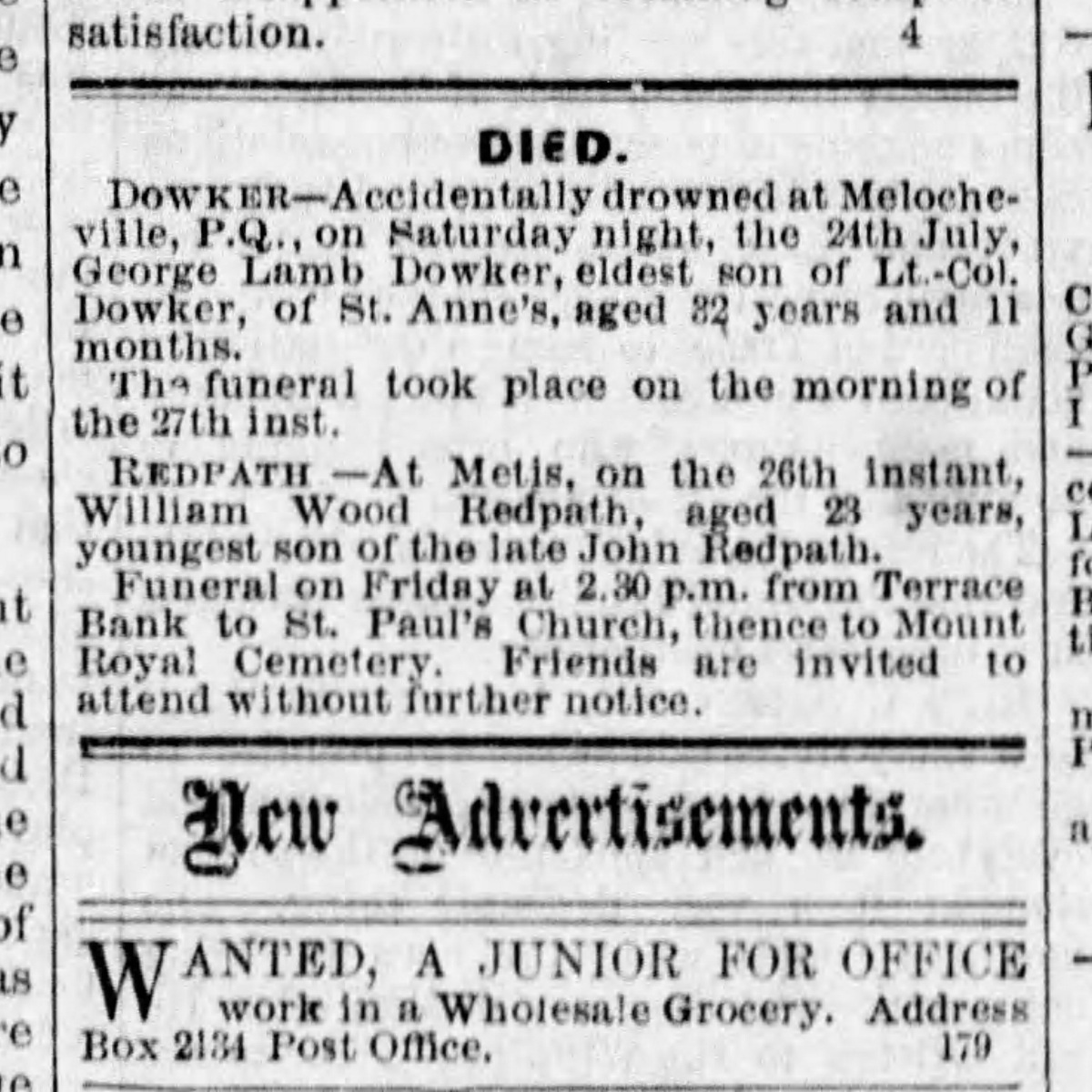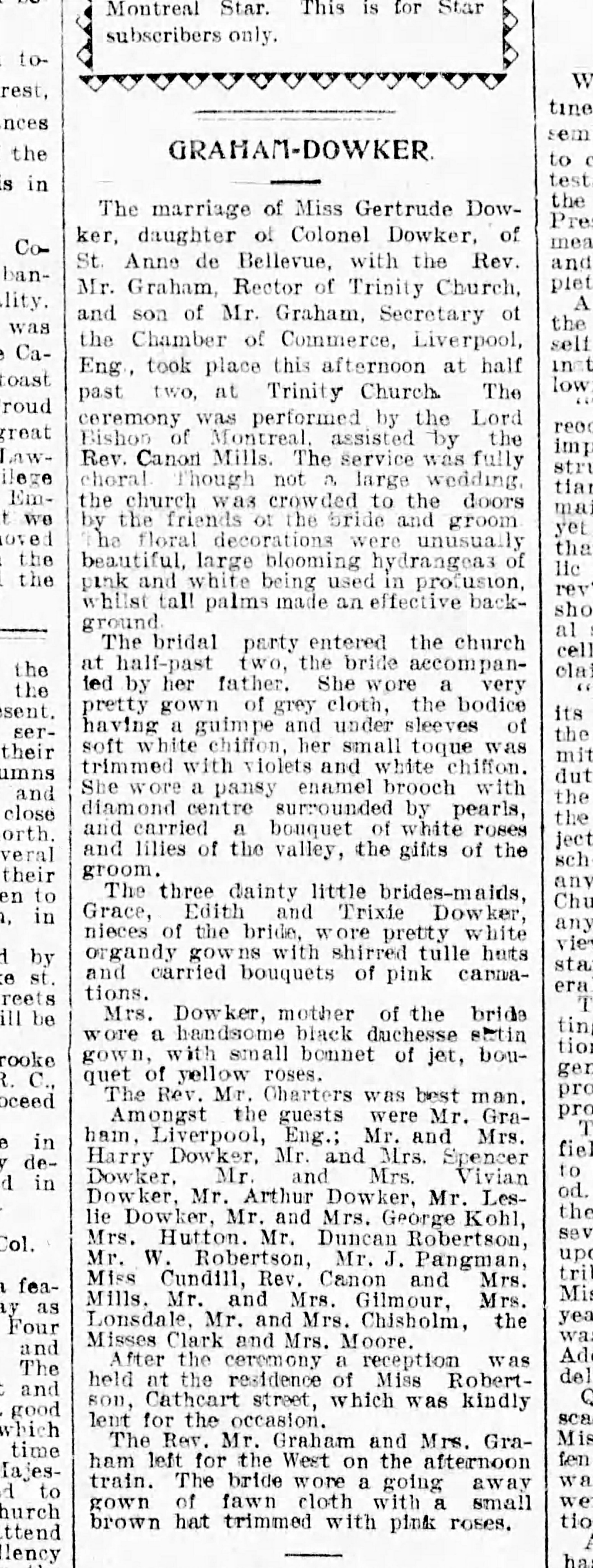 Marriage of Gertrude Dowker and Mr. Graham, Rector of Trinity Church, Jun 13, 1897, source: Montreal Daily Star