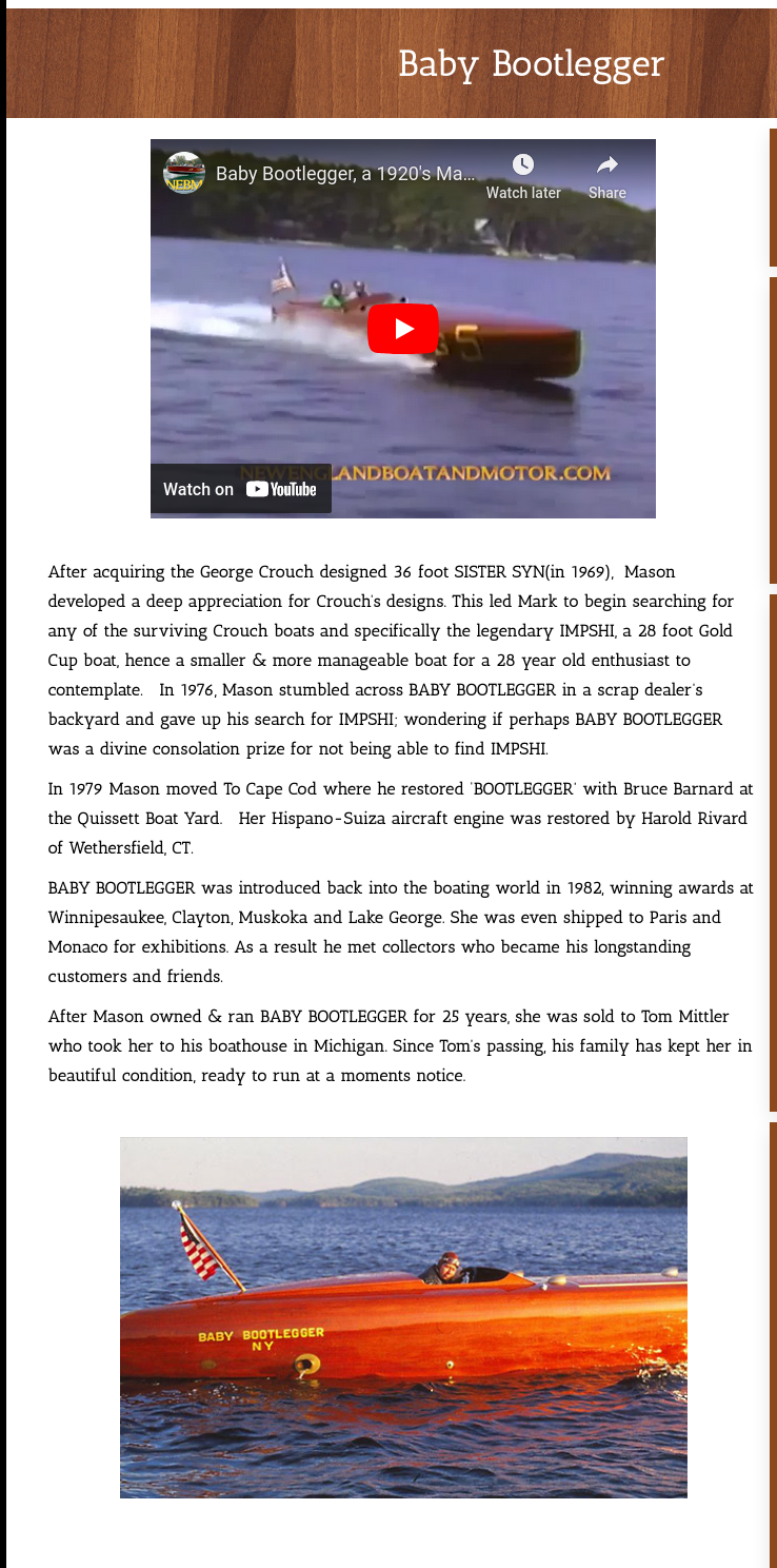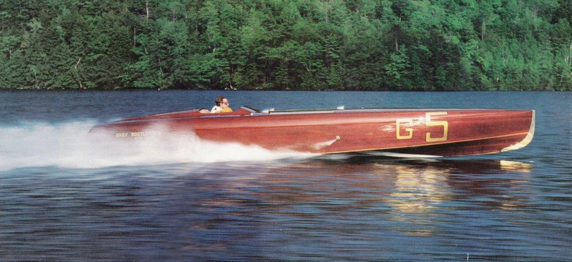 Beatrice Dowker and Roland B. Timberlake in Baby Bootlegger, 1927, source: Mark P. Mason. This mahogany boat was the fastest boat in North America. The boat is now a well kept collector's item, fully working, and sold in 2001 for about 3 million dollar.