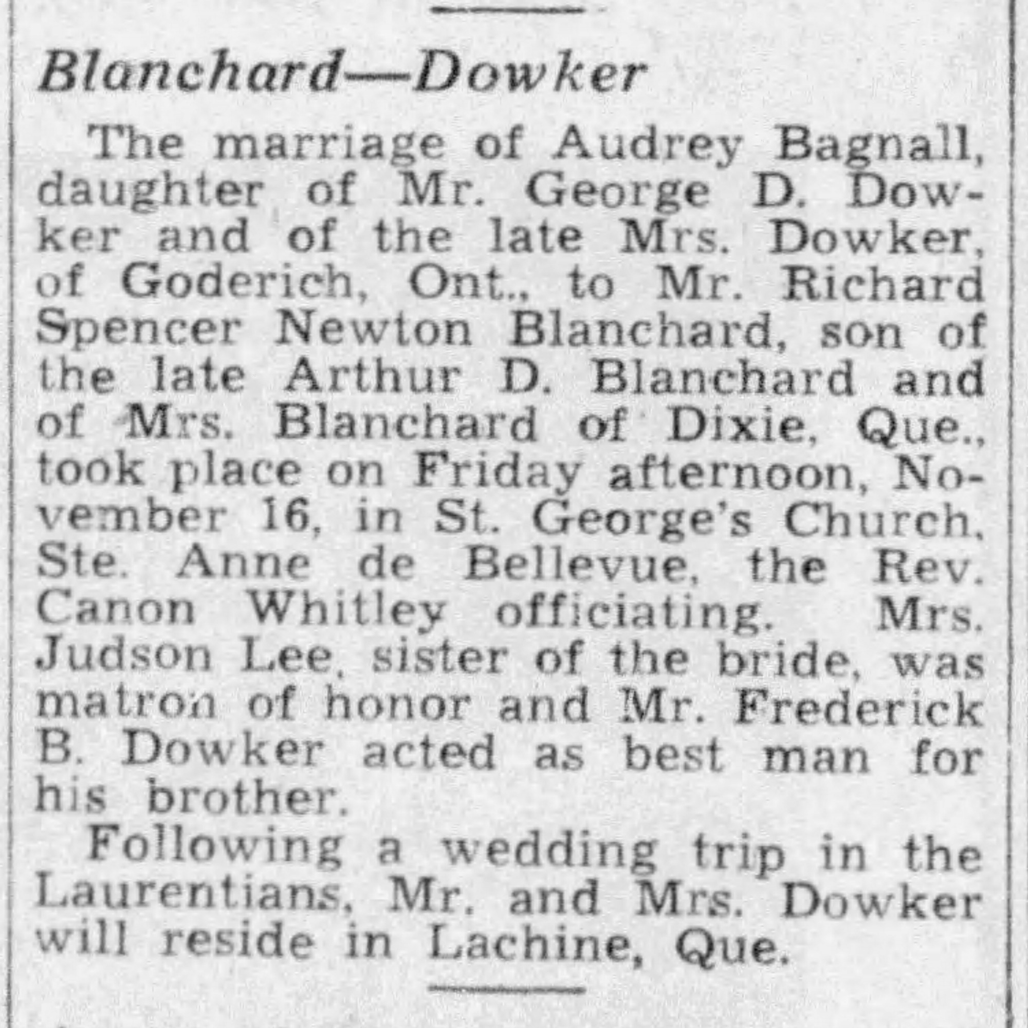 Audrey Bagnall Dowker marries Richard Spencer Newton Blanchard, source: the Gazette, Nov 29, 1945