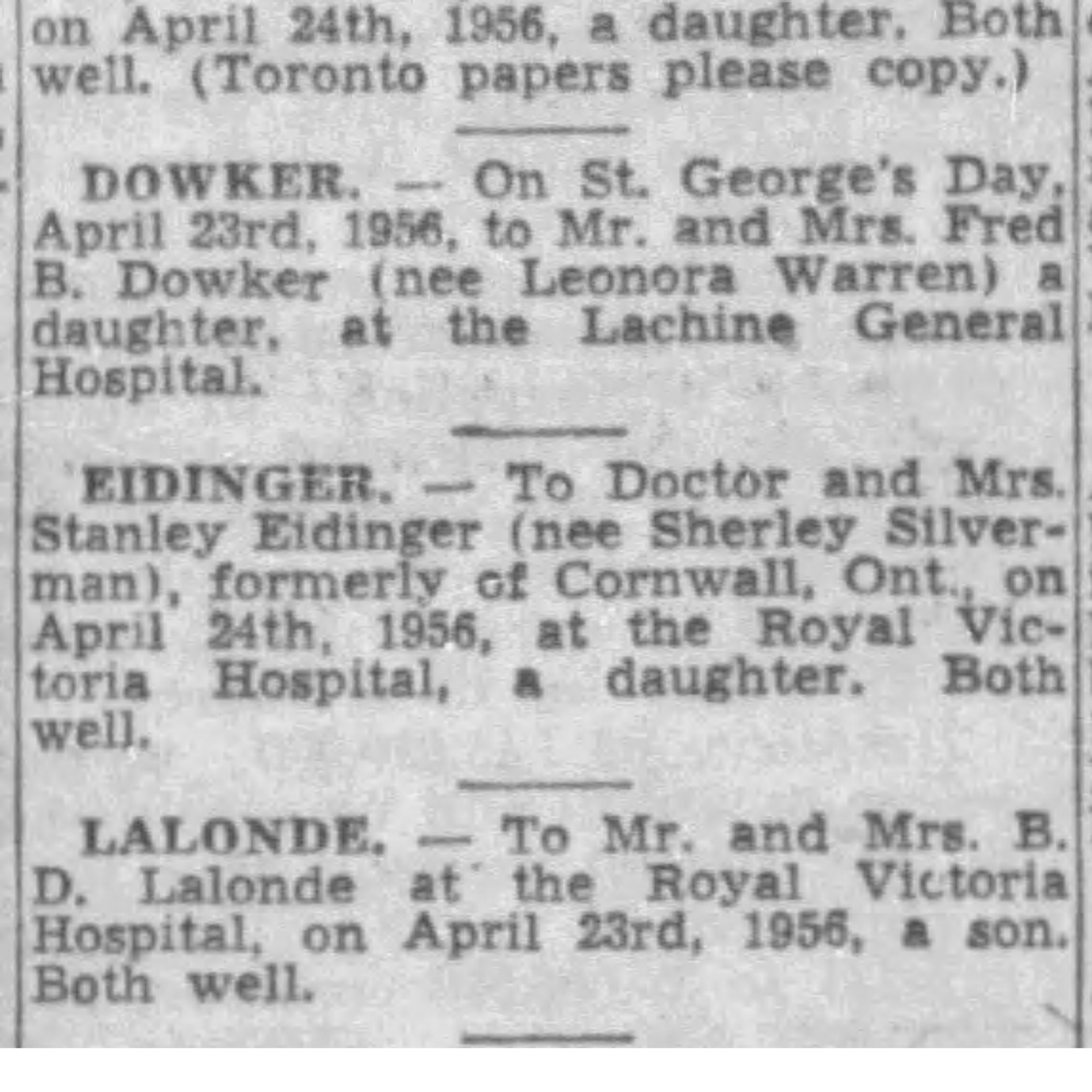Child born to Fred B. Dowker and Leonora Warren, source: the Gazette, Apr. 25, 1956