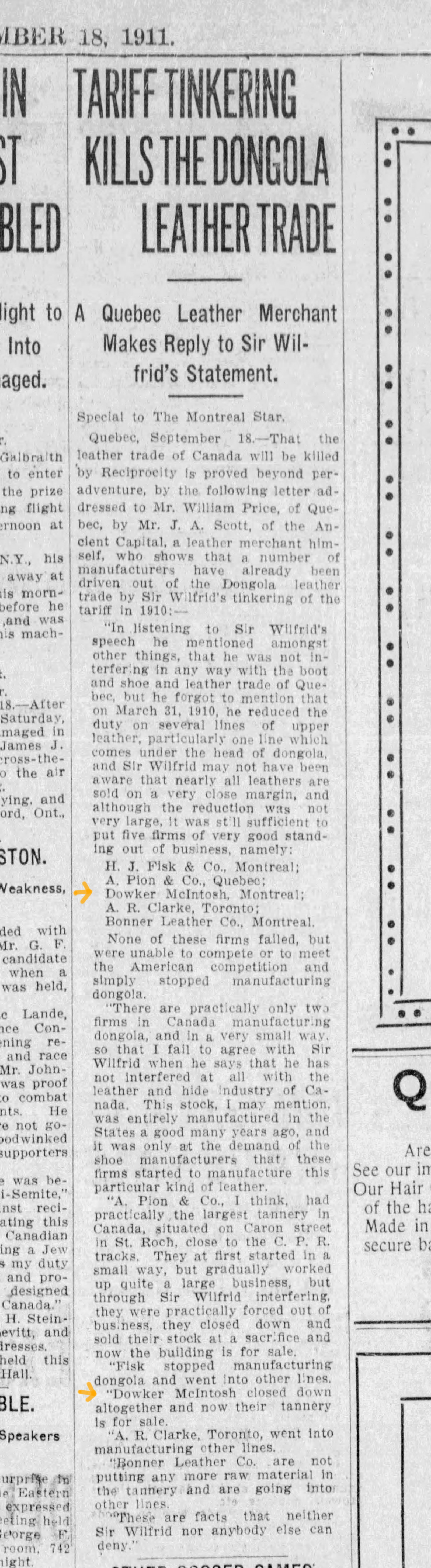 Tariff changes kill Dowker & McIntosh company, source: Montreal Daily Star, Sep 18, 1911, click to read
