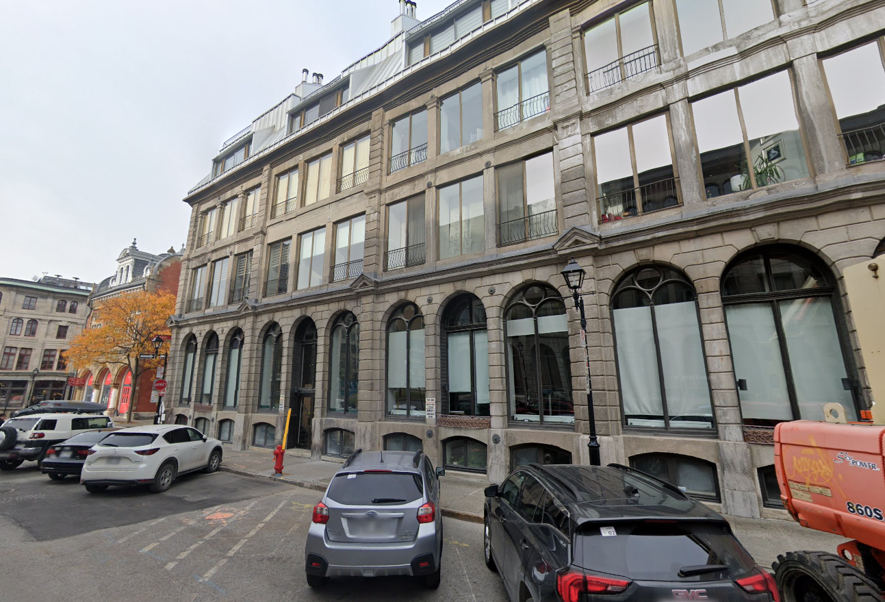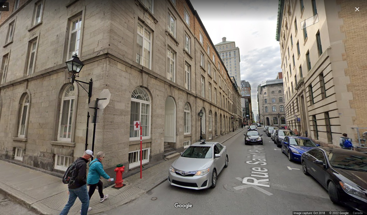 31 St-Peter Street (to the right of the water hydrant, 145 Rue St-Pierre), Central Fire Station is the red building in the back, source: google street-view, 2020