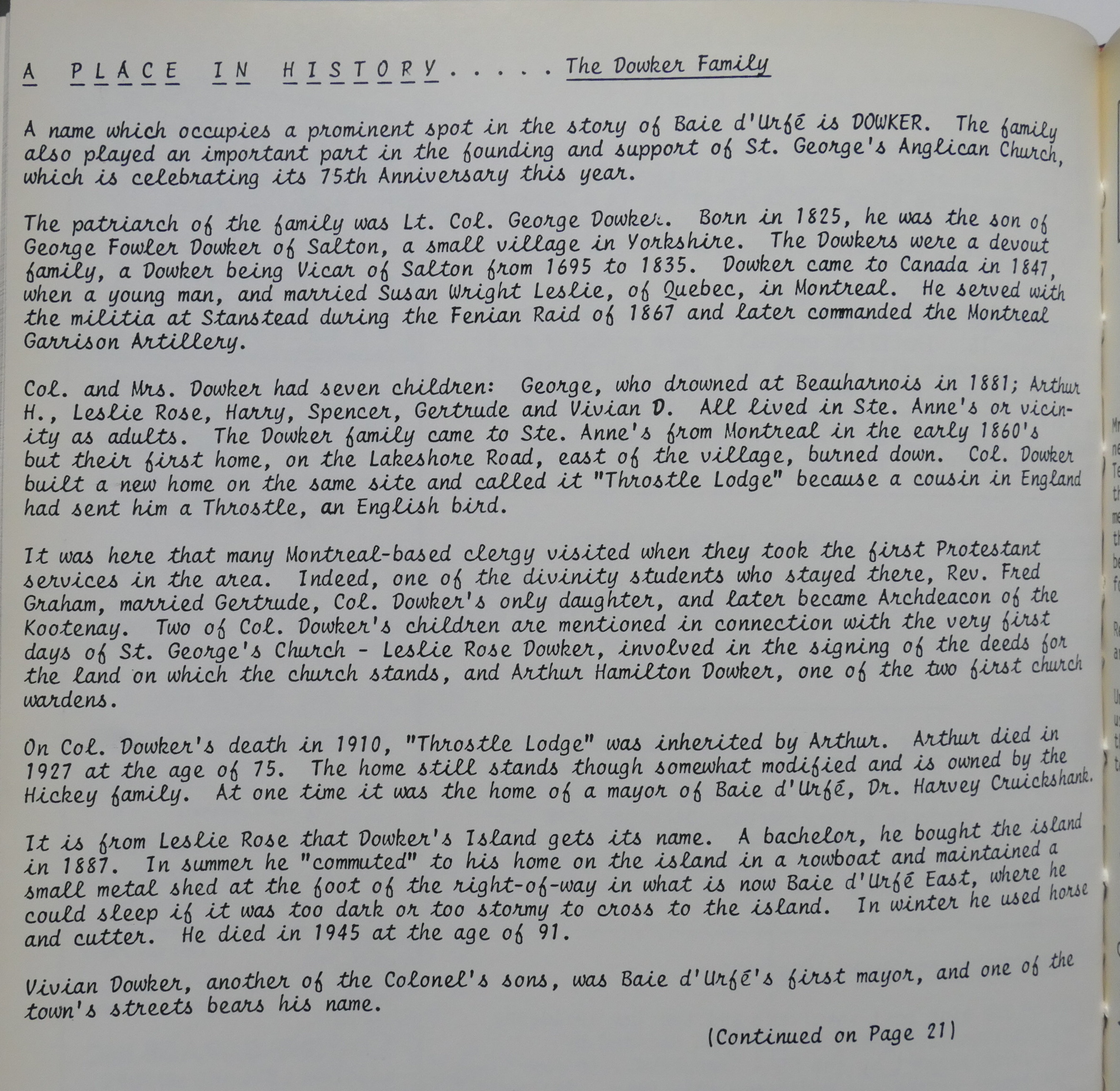 A name which occupies a prominent spot in the story of Baie d'Urfé is DOWKER. The family also played an important part in the founding and support of St. George's Anglican Church, which is celebrating its 75th Anniversary this year.