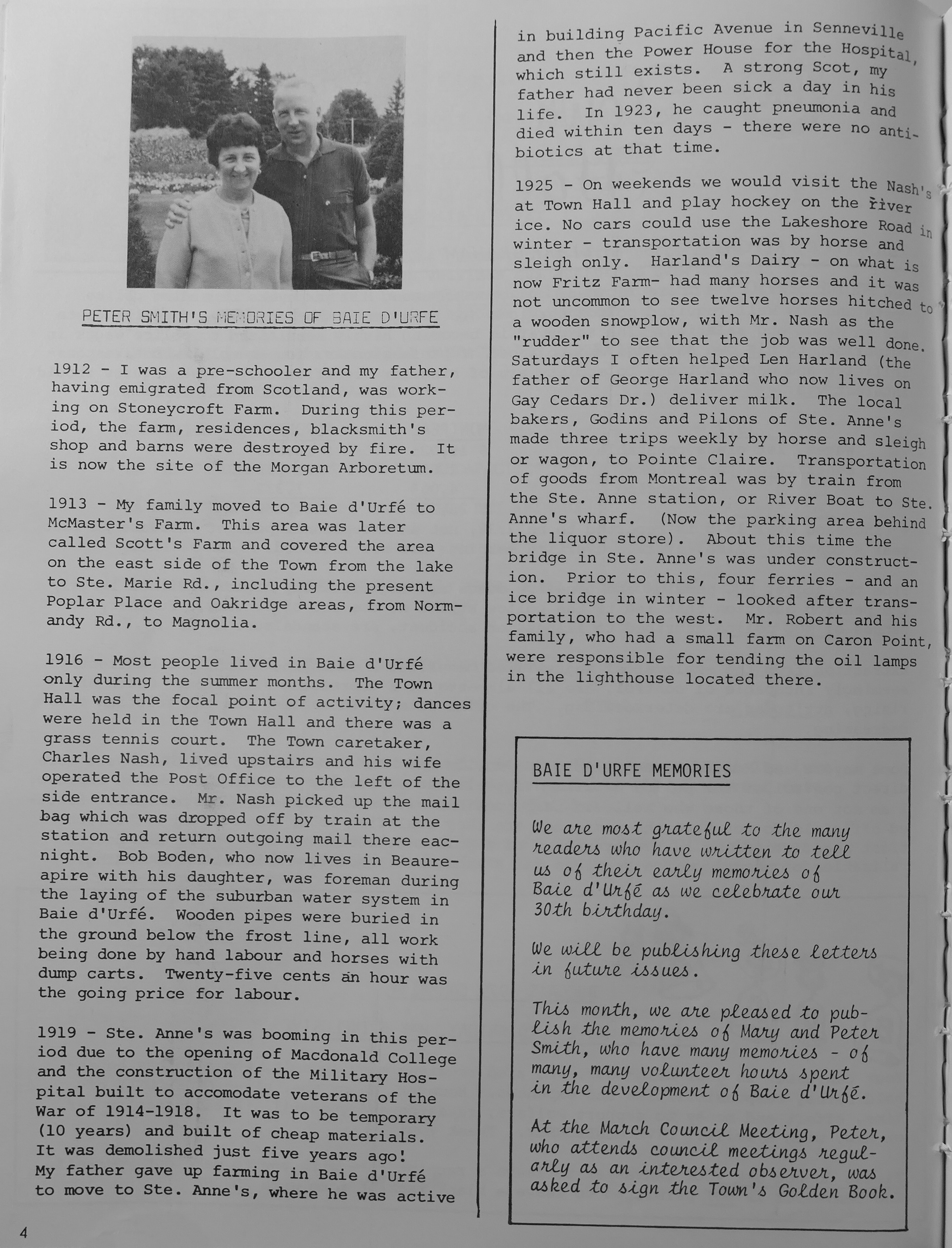 This month, we are pleased to publish the memories of Mary and Peter Smith, who have many memories - of many, many volunteer hours spent in the development of Baie d'Urfé.