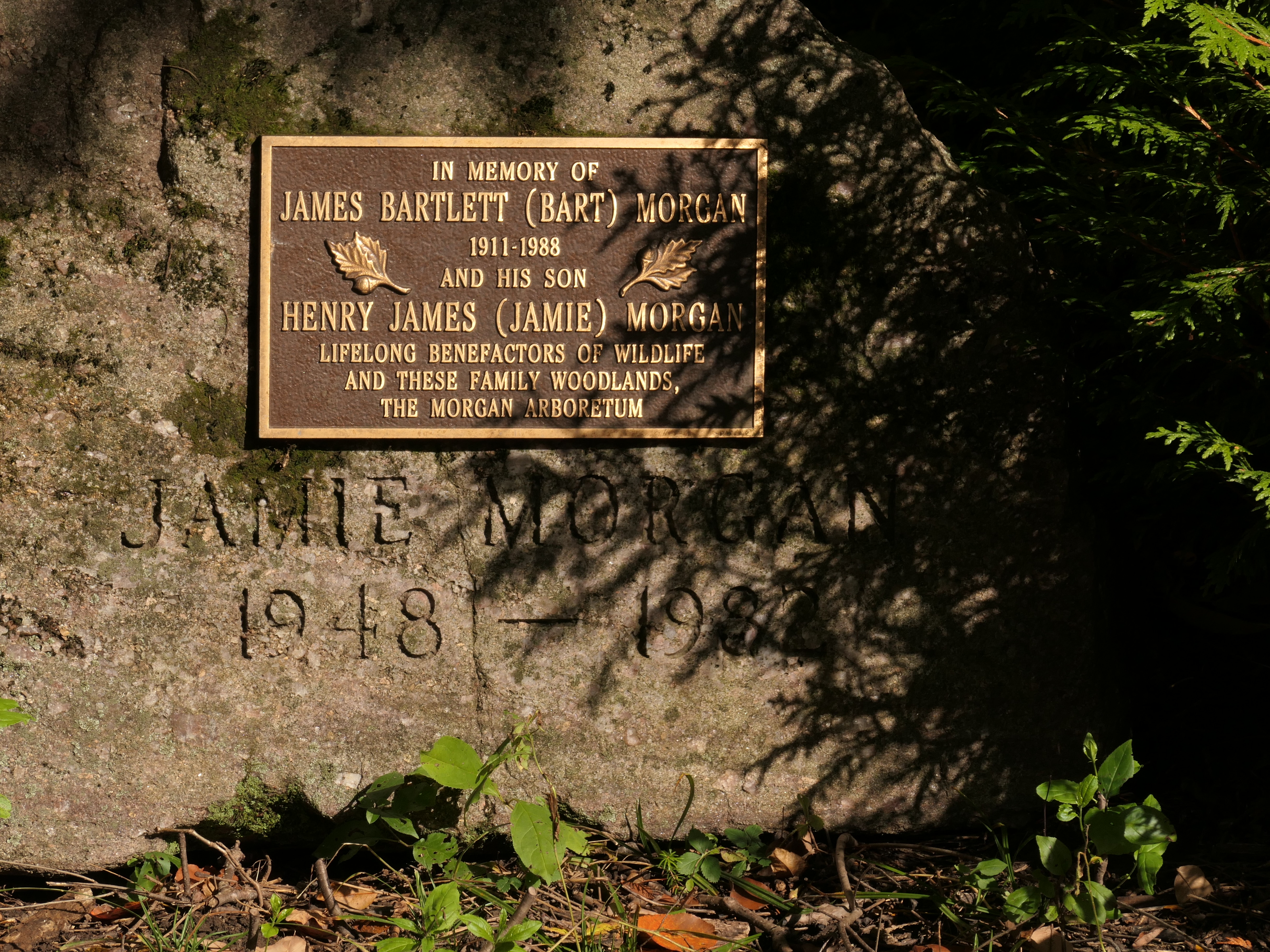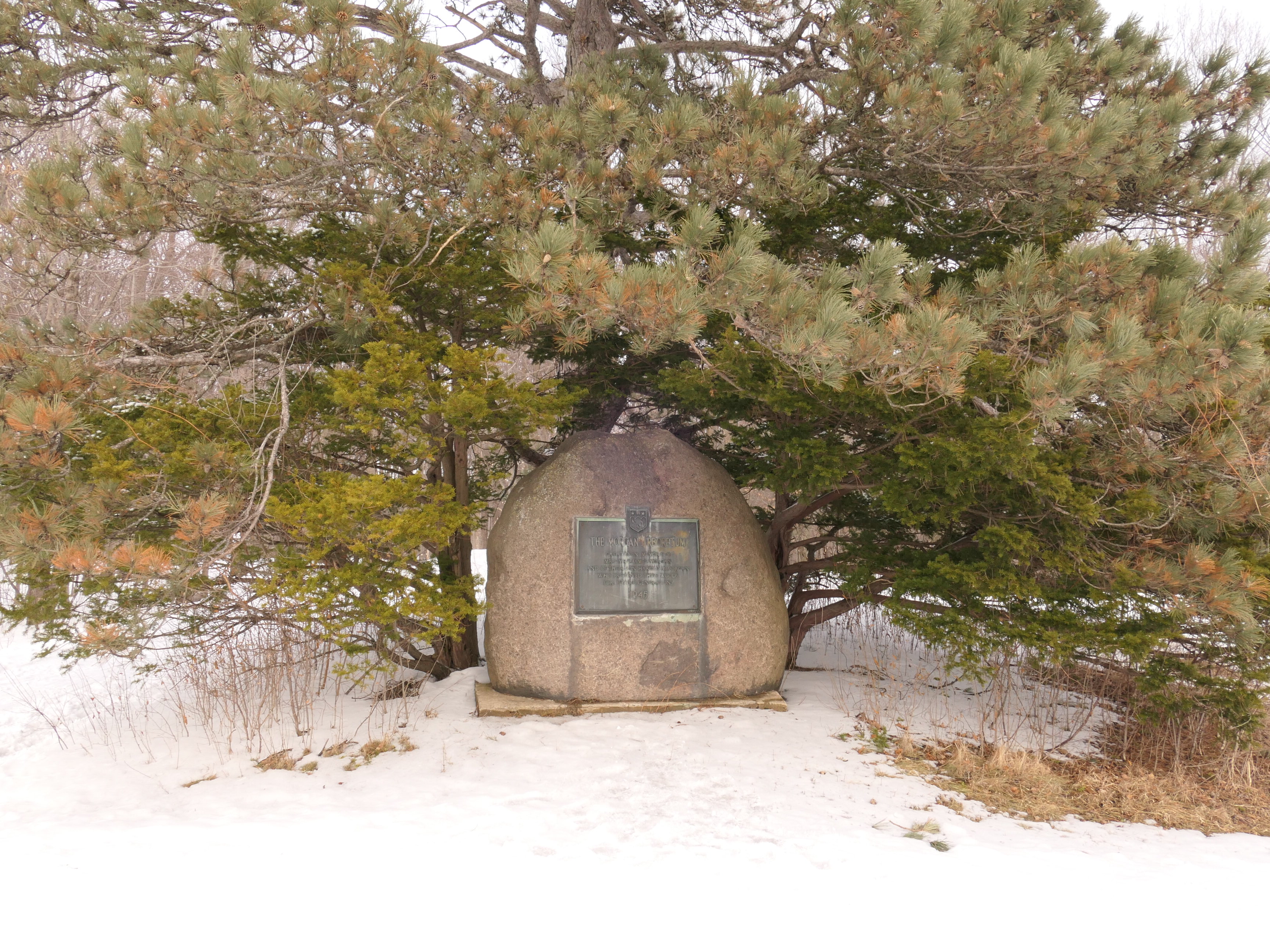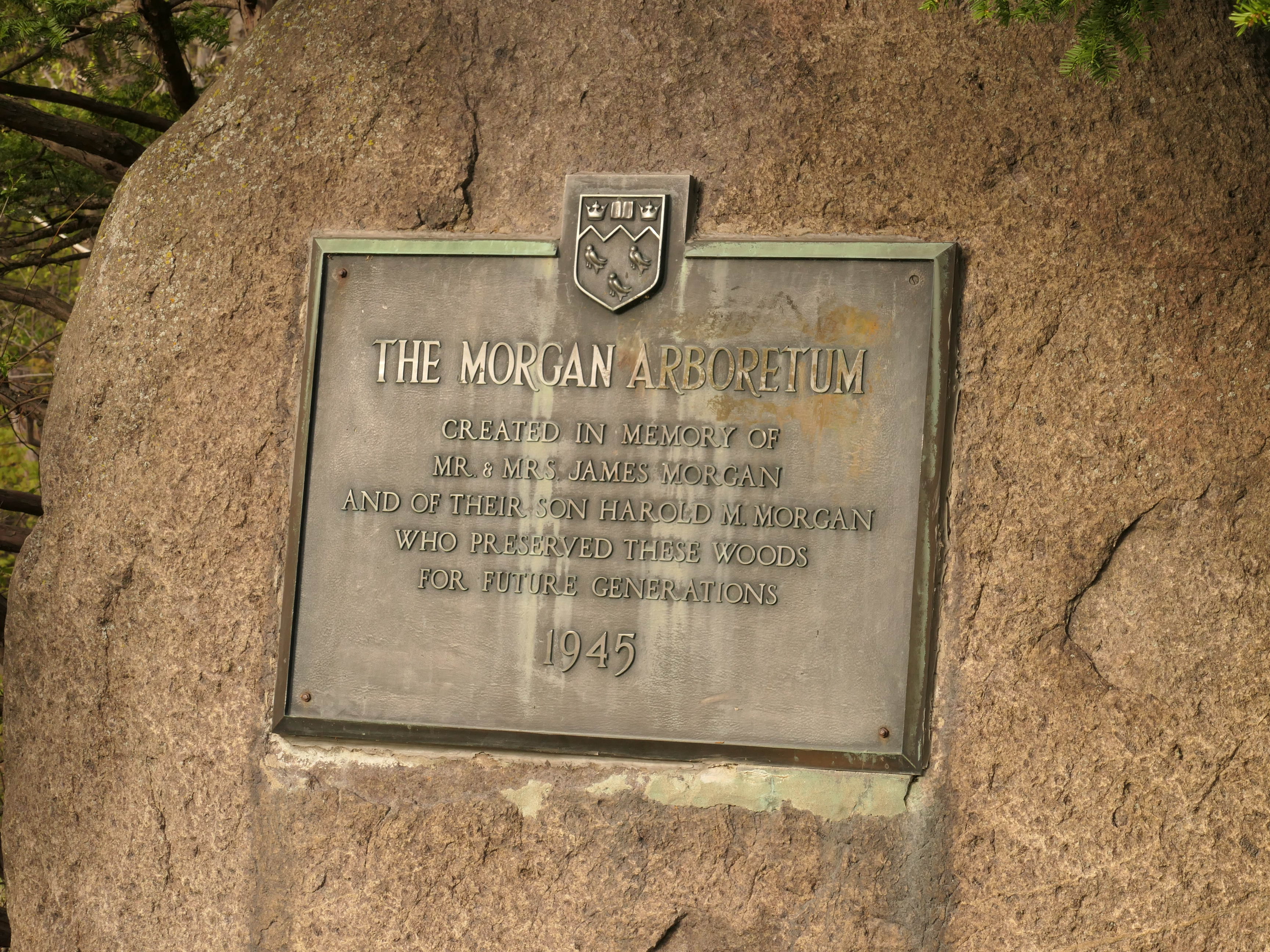Commemorative plaque: The Morgan Arboretum, Created in memory of Mr. & Mrs. James Morgan and of their son Harold M. Morgan who preserved these woods for future generations, 1945, photo: May 2020