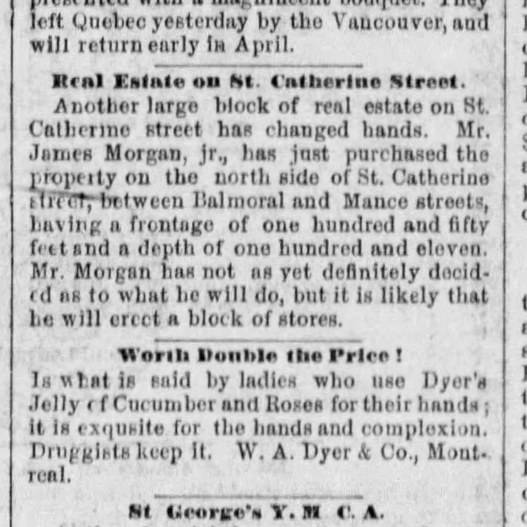 James Morgan buys property for the new store on St Catherine street, The Gazette, Nov. 22, 1889