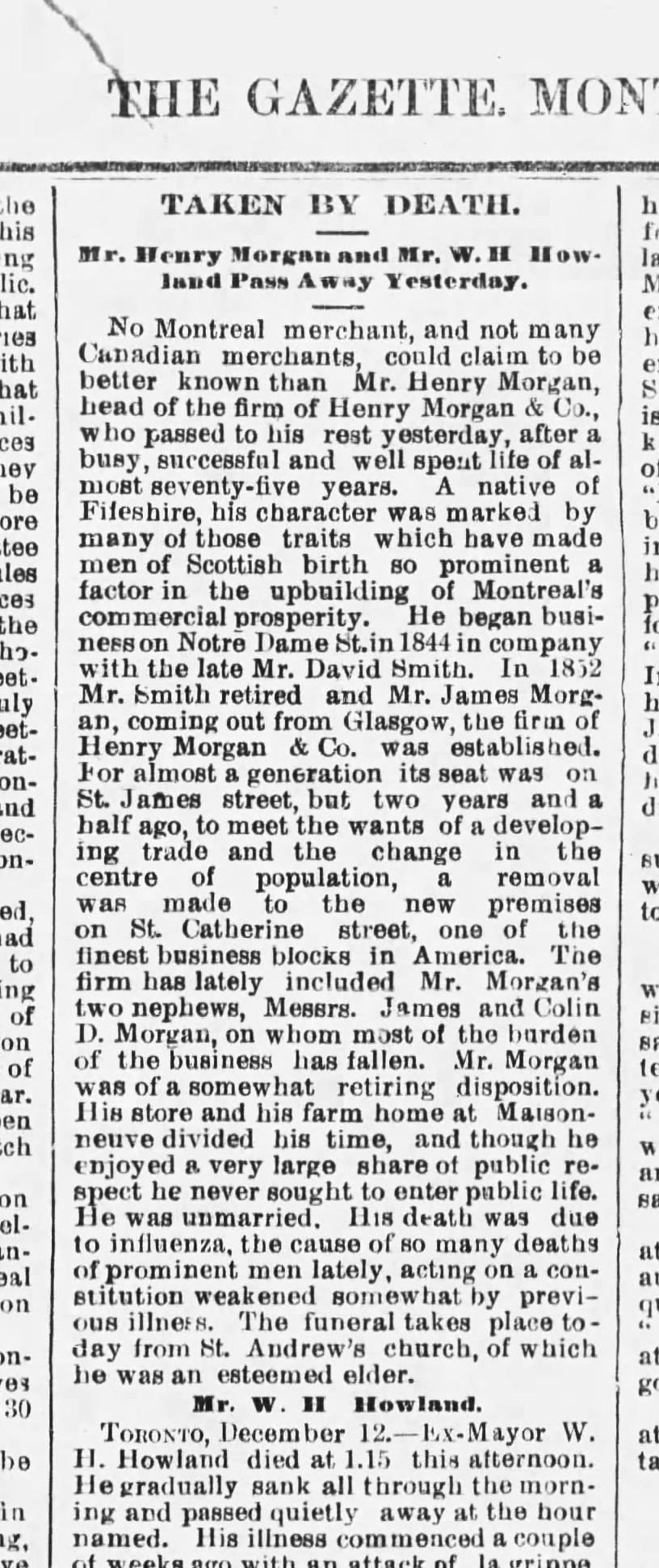 Henry Morgan asked his brother James to come to Montreal and Smith sold his share in the business at the beginning of 1851 to James Morgan.
