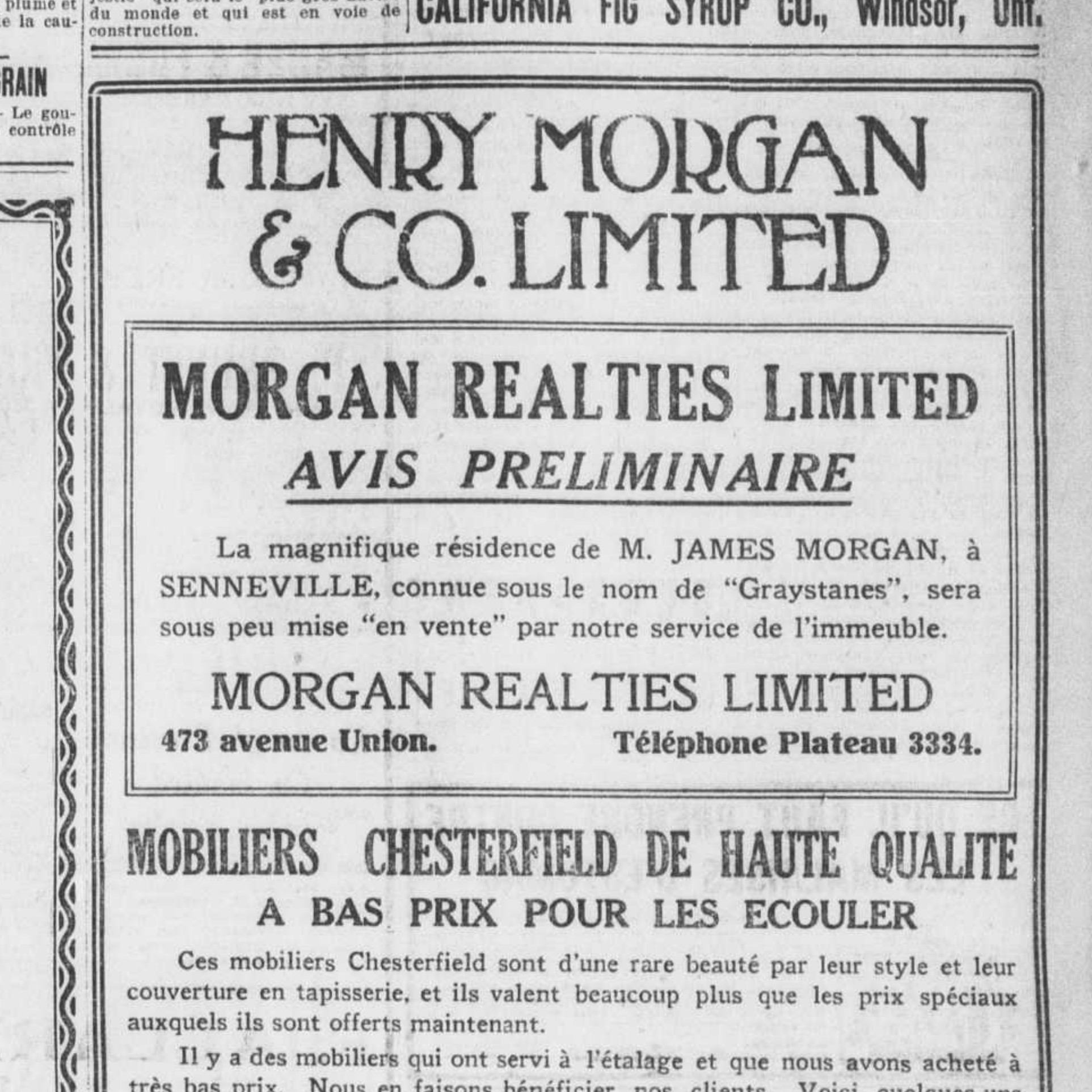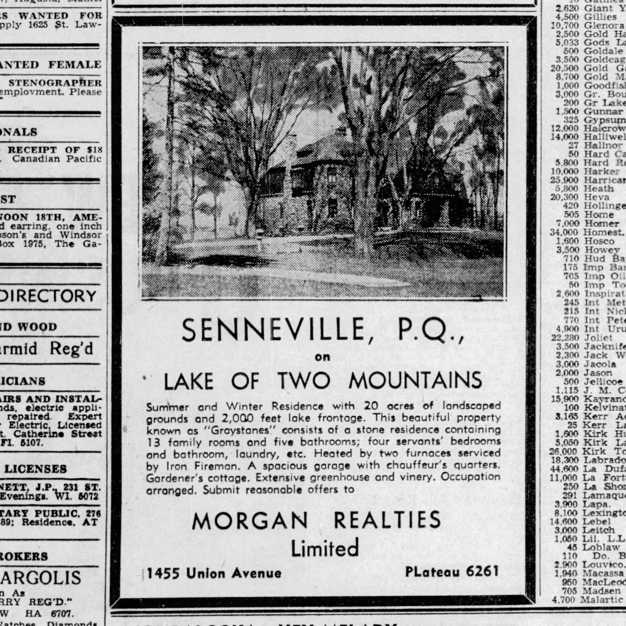 Sale of Graystanes, advertisement in La Presse, Oct 20, 1921, this must be the sale by a subsequent owner. Source: https://collections.banq.qc.ca/ ark:/52327/3105234