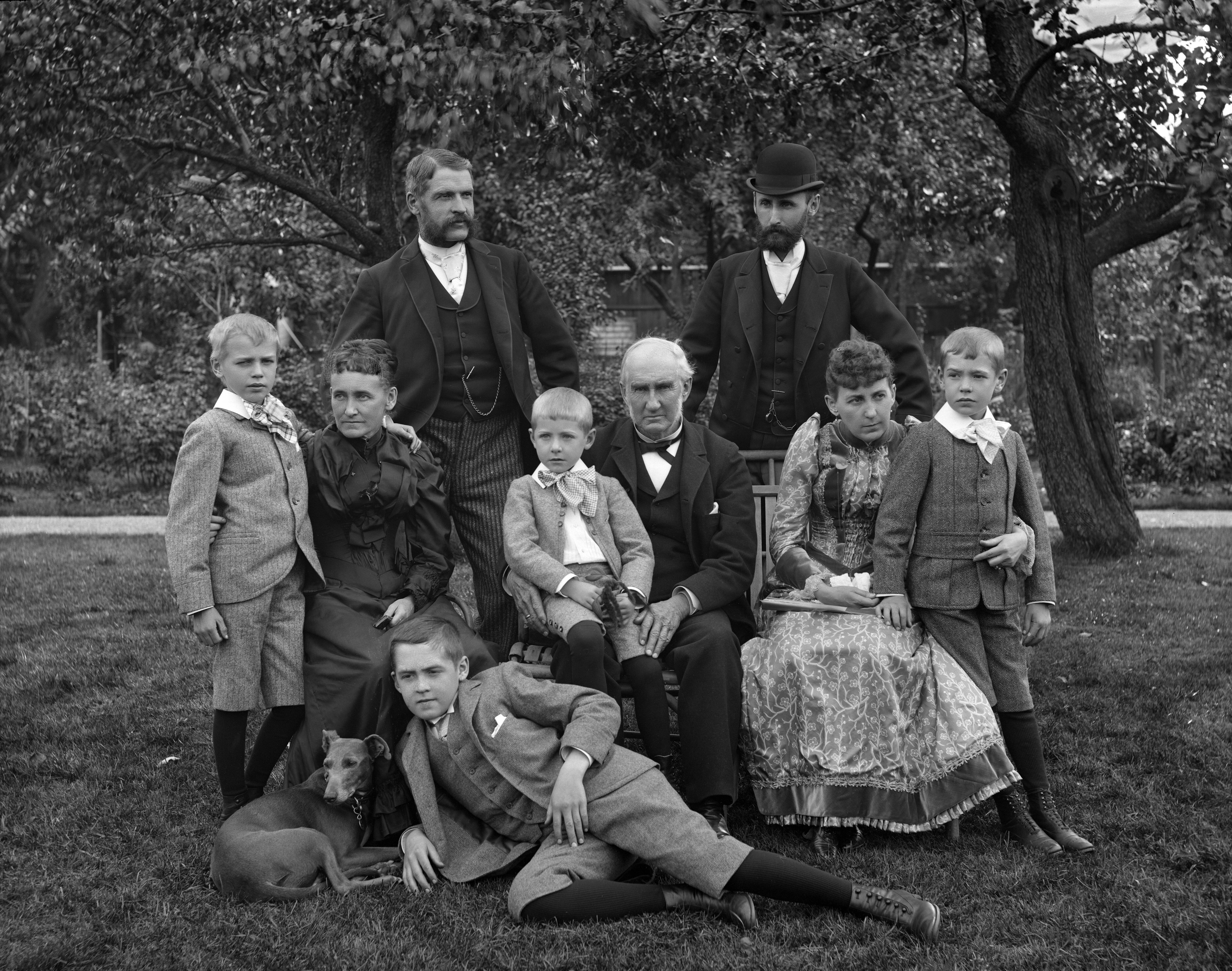 from left to right: back row: James Morgan II, Ken Campbell (husband of Kate) middle row: F. Cleveland Morgan, Anna Morgan (wife of James II), Harold Morgan, Henry Morgan (founder of the company), Kate Campbell (=Catherine Morgan sister of James II), J. Douglas Morgan front row: Dog Bowler, Kenneth Campbell (son of Ken and Kate)
