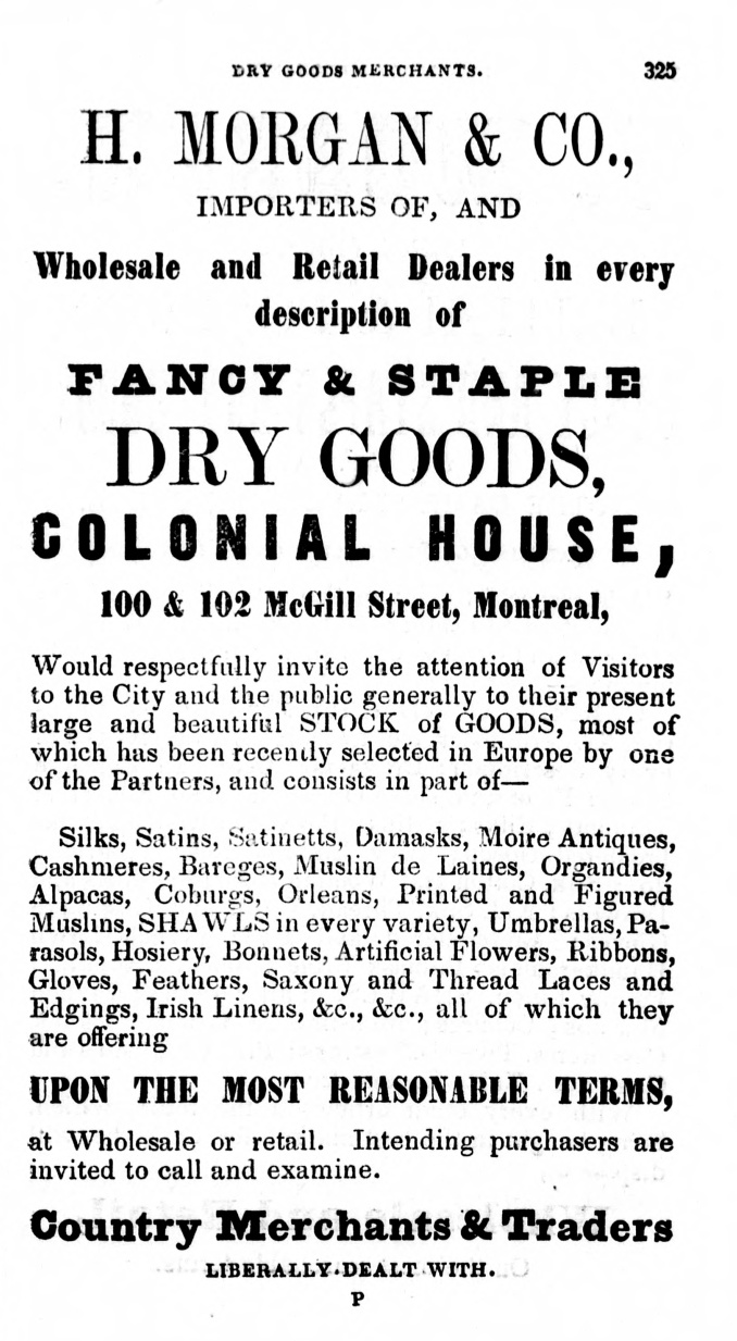 Dry goods, H. Morgan & Co, page 325 of the Montreal directory new edition, published 1854, source: hathitrust.org