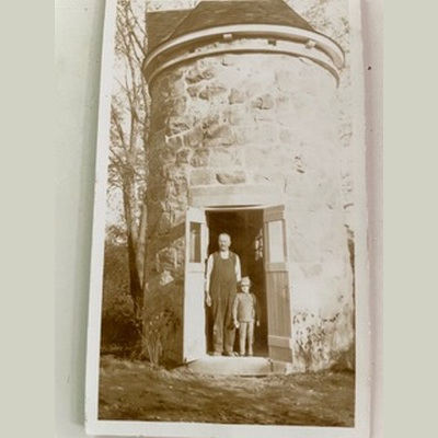 Felix Brunet with granddaughter Marguerite at the pigeon house, source: Janette Haggar