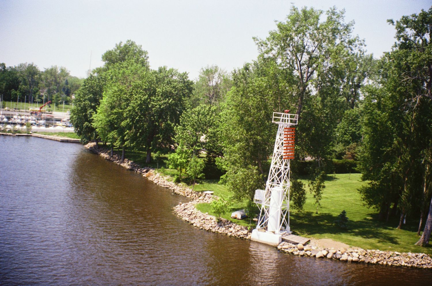 Pointe Caron was "sticking out quite far" prior to the creation of the Yacht Club and presented an excellent position for the installation of a navigation light. The next navigation light in the Baie-D'Urfé area was on Dowker Island. These navigation lights are obviously a more recent invention compared to the history of Pointe Caron itself. Pointe Caron had a lighthouse with a wooden tower installed in 1874 and later, in 1934, it was replaced by a simple red light on a steel skeleton tower. The steel tower was a bit higher than the original wooden lighthouse. The light and tower were finally removed in 1996. Below are a picture of the original lighthouse and the subsequent navigation light on the metal tower.