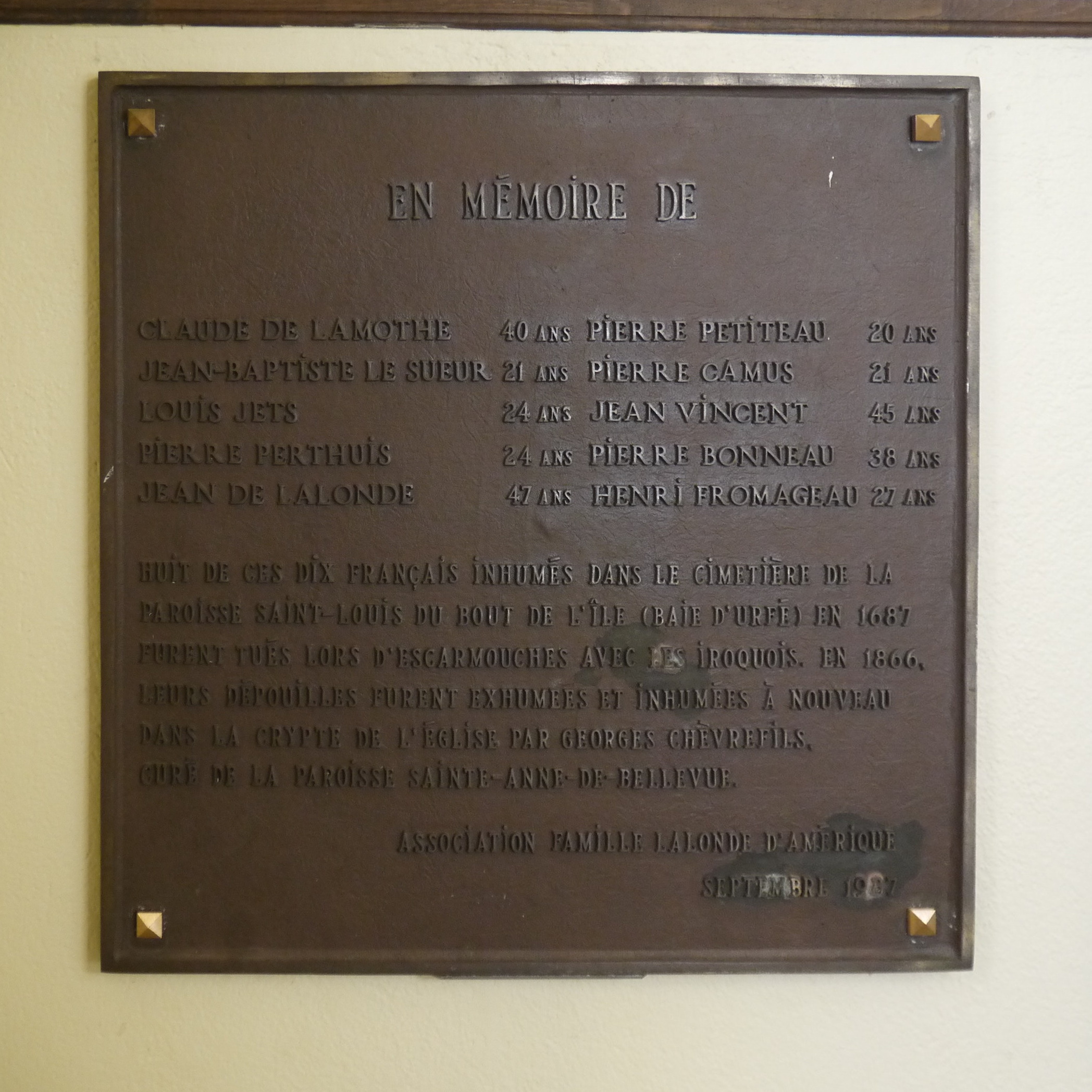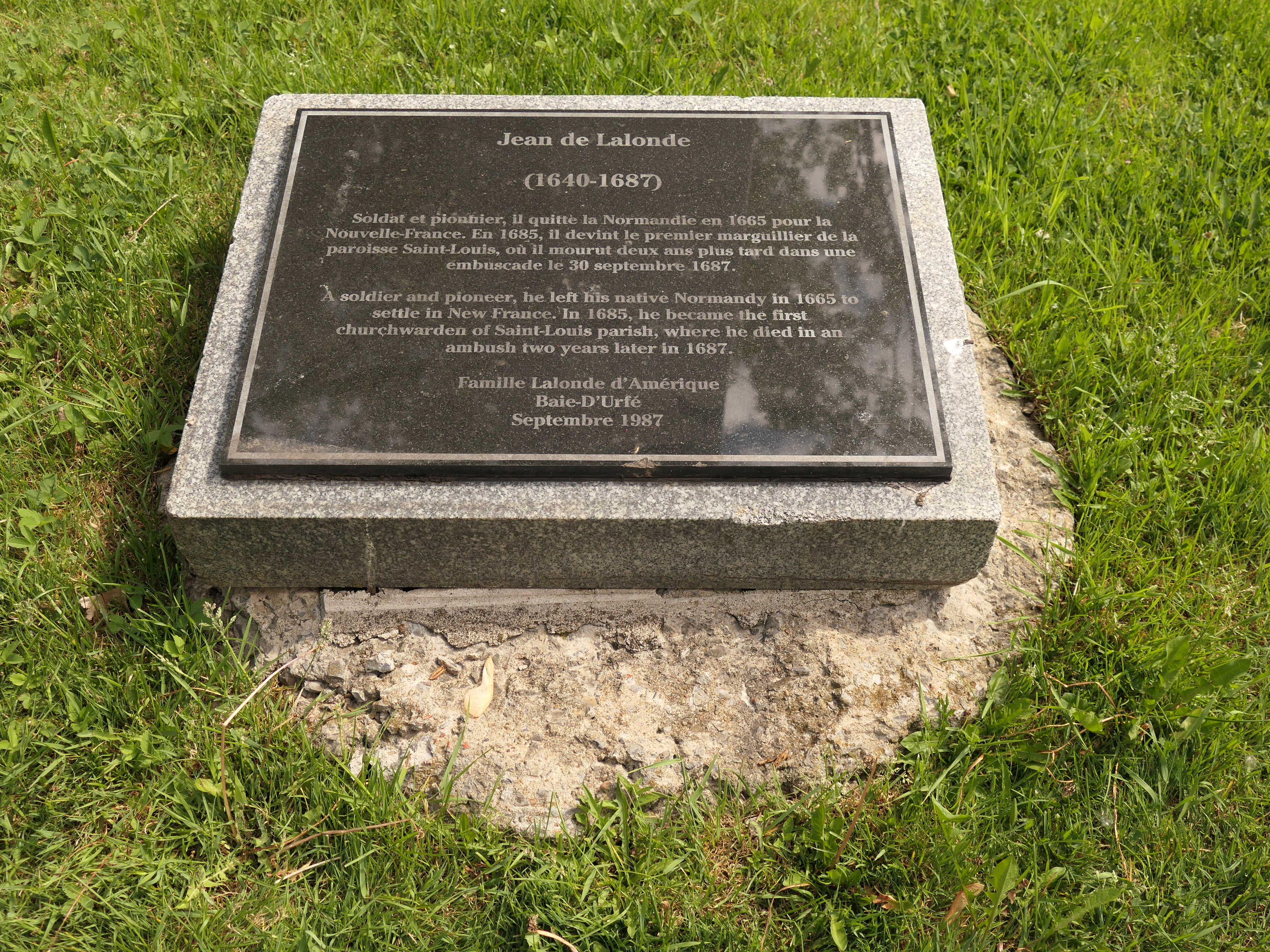 François D'Urfé buried all others either "in the cemetery" or "near the church" or "near the place to build the church". Jean de Lalonde is the only one who was buried inside the church (dans l'enceinte de l'Église). The Lalonde family erected 300 years after Jean's death a memorial. It stands near Point Caron, at Berthold Park.