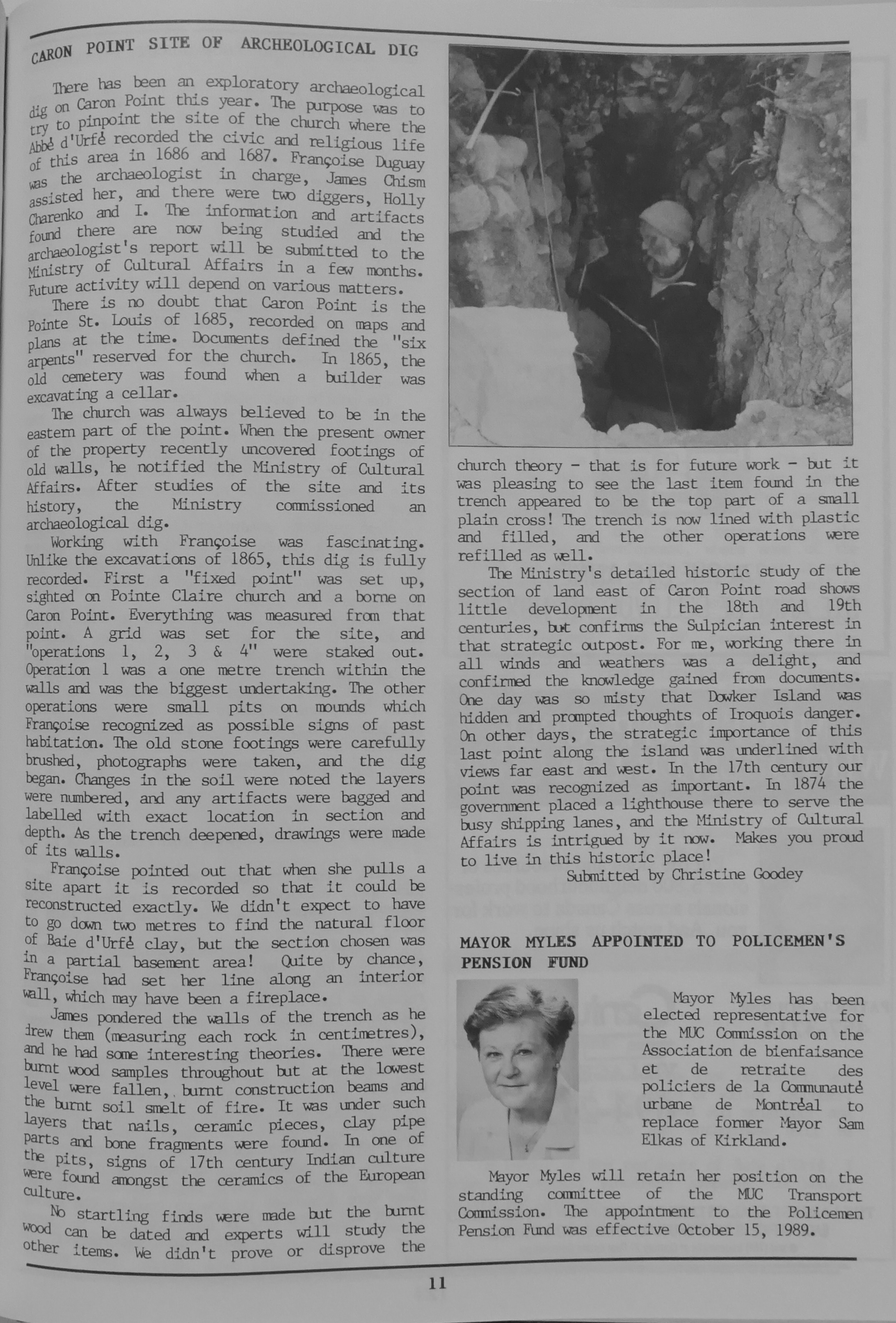 N&V report about the archeological dig at caron point by Christine Goodey who had participated in the project, she lived at 37 Morgan and she is one of the authors of the Baie d'Urfé 1686-1986 book, source: N&V Oct. 1989, click on the picture to read