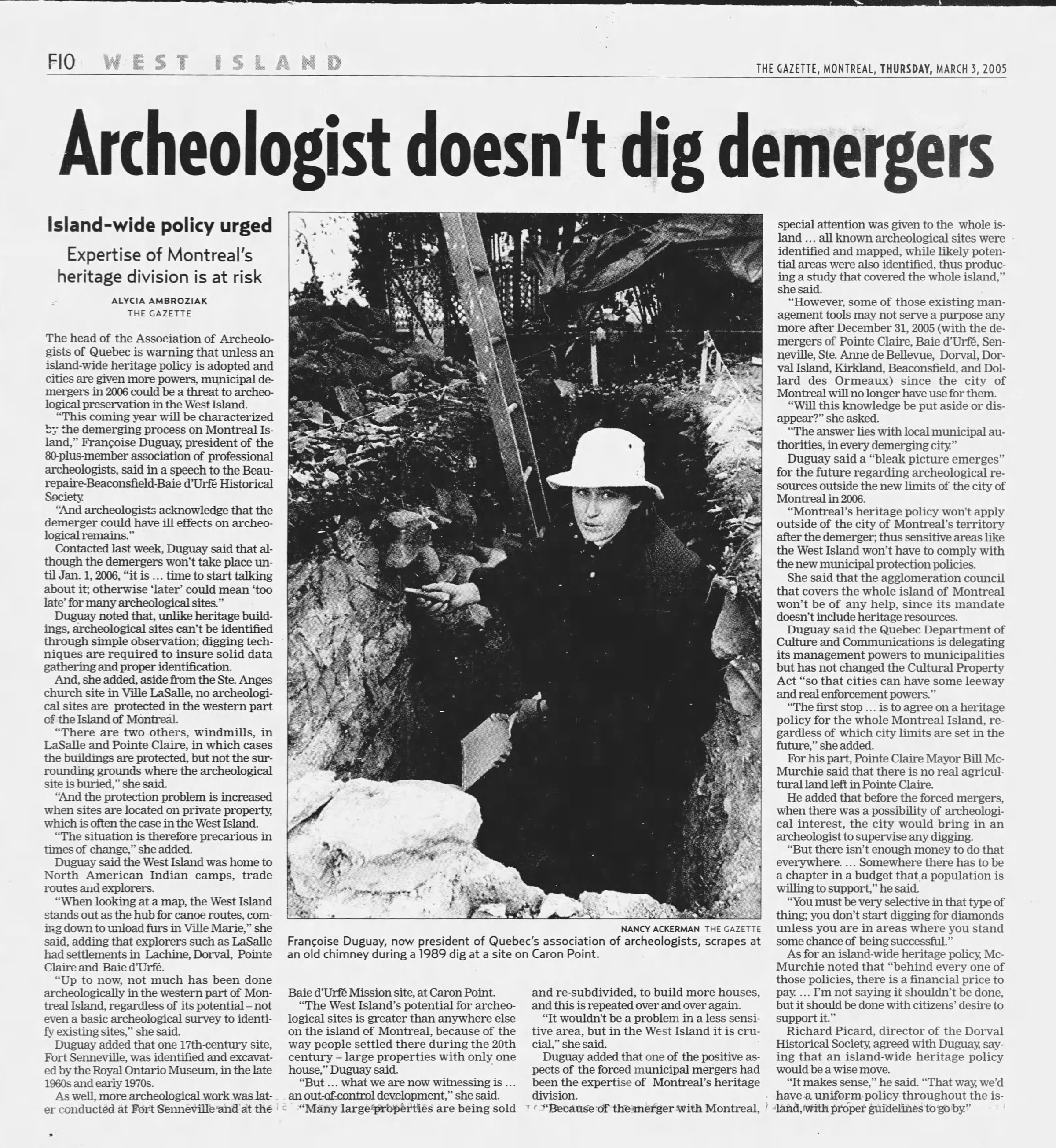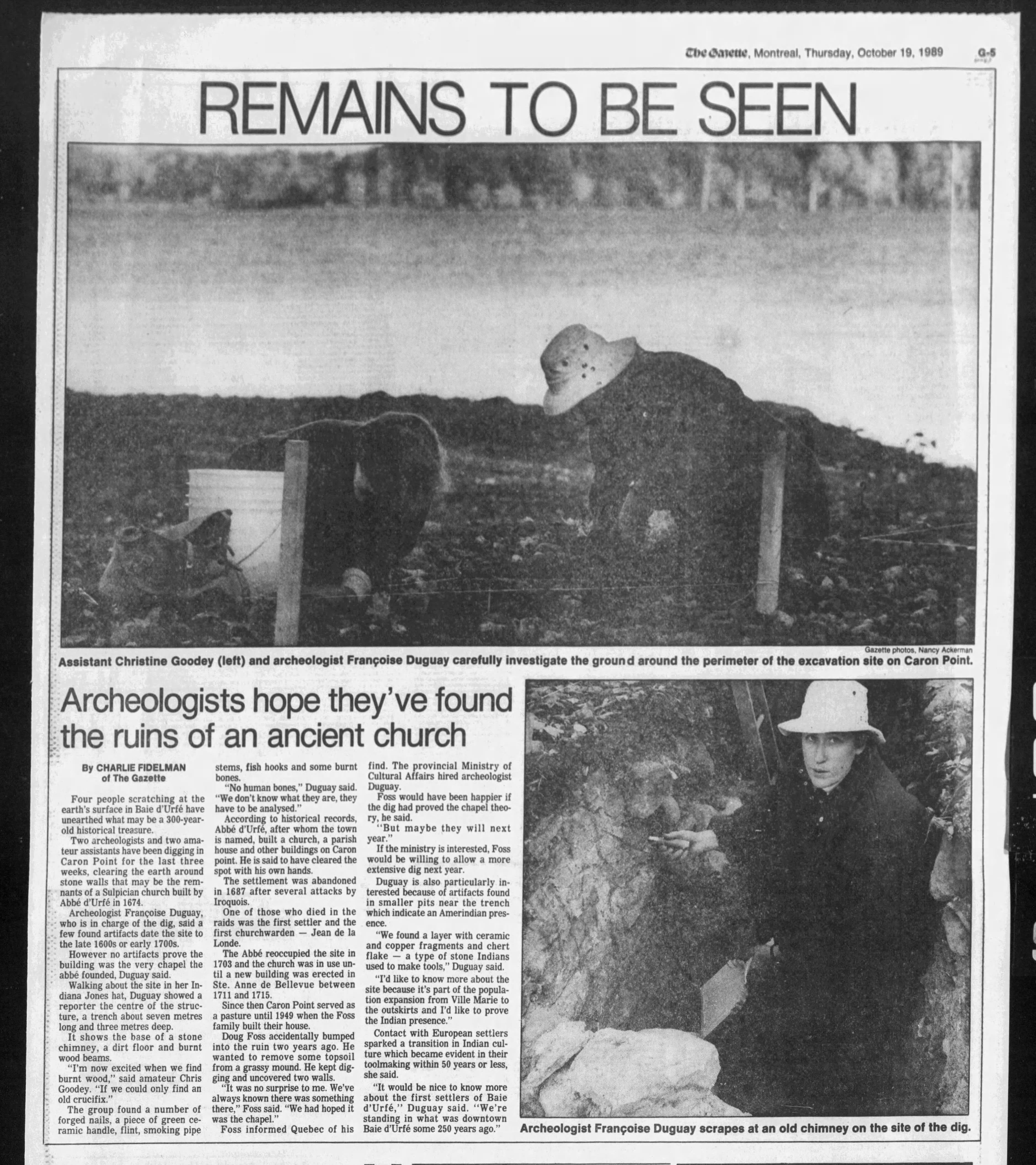 Archeologistis at Pointe Caron have to stop, The Gazette, March 3, 2005, click image to read, note: the Gazette seems to have re-used the 1989 picture of the chimney