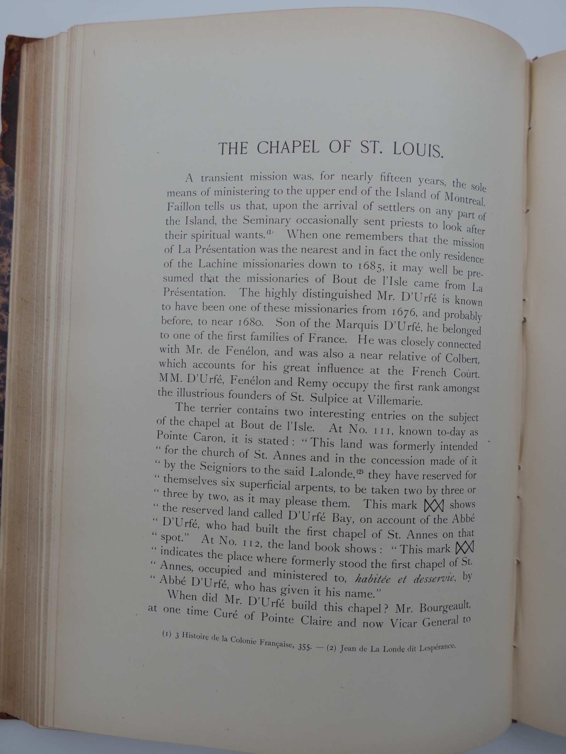 The terrier (land register) contains two interesting entries on the subject of the chapel at Bout de l'Isle. At No. 111, known to-day as Pointe Caron, it is stated: "This land was formerly intended for the church of St. Annes and in the concession made of it by the Seigniors to the said Lalonde,(2) they have reserved for themselves six superficial arpents, to be taken two by three or three by two, as it may please them. This mark |W| shows the reserved land called D'Urfé Bay, on account of the Abbé D'Urfé, who had built the first chapel of St. Annes on that spot."
