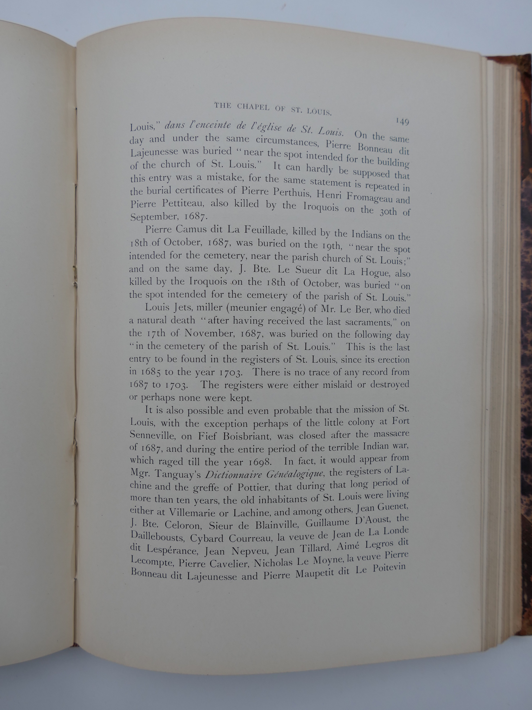 It is also possible and even probable that the mission of St. Louis, with the exception perhaps of the little colony at Fort Senneville, on Fief Boisbriant, was closed after the massacre of 1687, and during the entire period of the terrible Indian war, which raged till the year 1698. In fact, it would appear from Mgr. Tanguay's Dictionnaire Généalogique, the registers of Lachine and the greffe of Pottier, that during that long period of more than ten years, the old inhabitants of St. Louis were living either at Villemarie or Lachine, and among others, Jean Guenet, J. Bte. Celoron, Sieur de Blainville, Guillaume D'Aoust, the Daillebousts, Cybard Courreau, la veuve de Jean de La Londe dit Lesperance, Jean Nepveu, Jean Tillard, Aimé Legros dit Lecompte, Pierre Cavelier, Nicholas Le Moyne, la veuve Pierre Bonneau dit Lajeunesse and Pierre Maupetit dit Le Poitevin