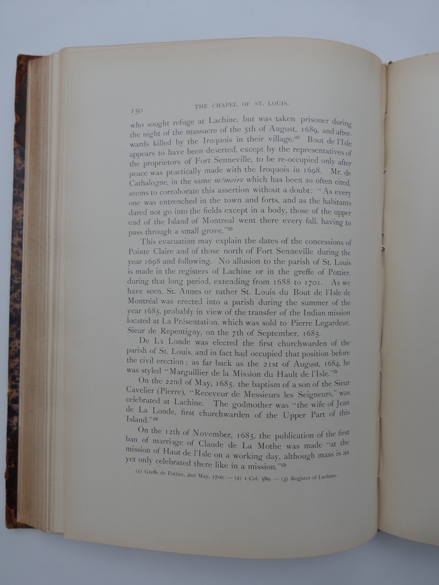 This evacuation may explain the dates of the concessions of Pointe Claire and of those north of Fort Senneville during the year 1698 and following. No allusion to the parish of St. Louis is made in the registers of Lachine or in the greffe of Pottier, during that long period, extending from 1688 to 1701. As we have seen, St. Annes or rather St. Louis du Bout de l'Isle de Montréal was erected into a parish during the summer of the year 1685, probably in view of the transfer of the Indian mission located at La Présentation, which was sold to Pierre Legardeur, Sieur de Repentigny, on the 7th of September, 1685.
