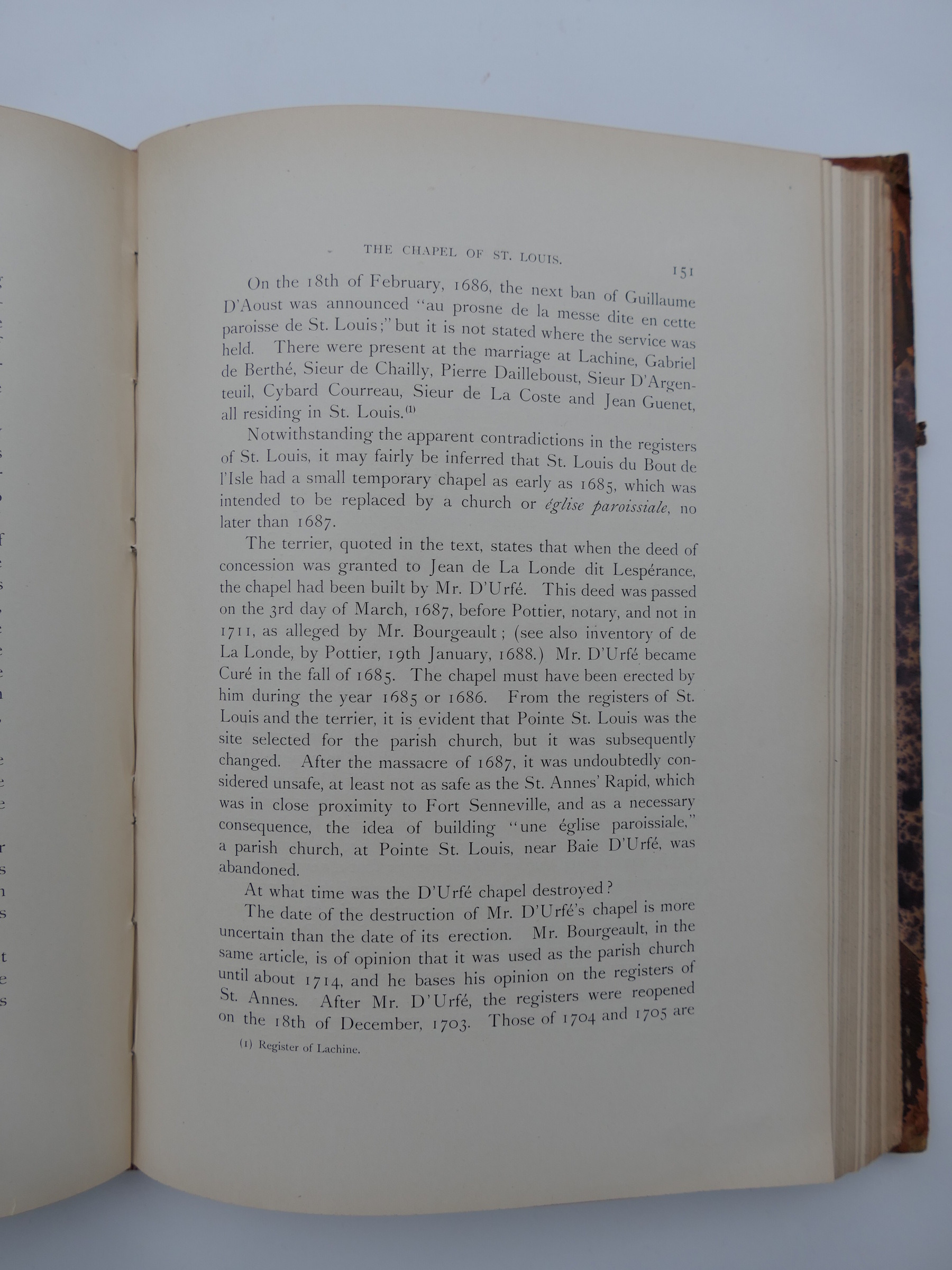 The terrier, quoted in the text, states that when the deed of concession was granted to Jean de La Londe dit Lespérance, the chapel had been built by Mr. D'Urfé. This deed was passed on the 3rd day of March, 1687, before Pottier, notary, and not in 1711, as alleged by Mr. Bourgeault ; (see also inventory of de La Londe, by Pottier, 19th January, 1688.) Mr. D'Urfé became Curé in the fall of 1685. The chapel must have been erected by him during the year 1685 or 1686. From the registers of St. Louis and the terrier, it is evident that Pointe St. Louis was the site selected for the parish church, but it was subsequently changed. After the massacre of 1687, it was undoubtedly considered unsafe, at least not as safe as the St. Annes' Rapid, which was in close proximity to Fort Senneville, and as a necessary consequence, the idea of building "une église paroissiale," a parish church, at Pointe St. Louis, near Baie D'Urfé, was abandoned.