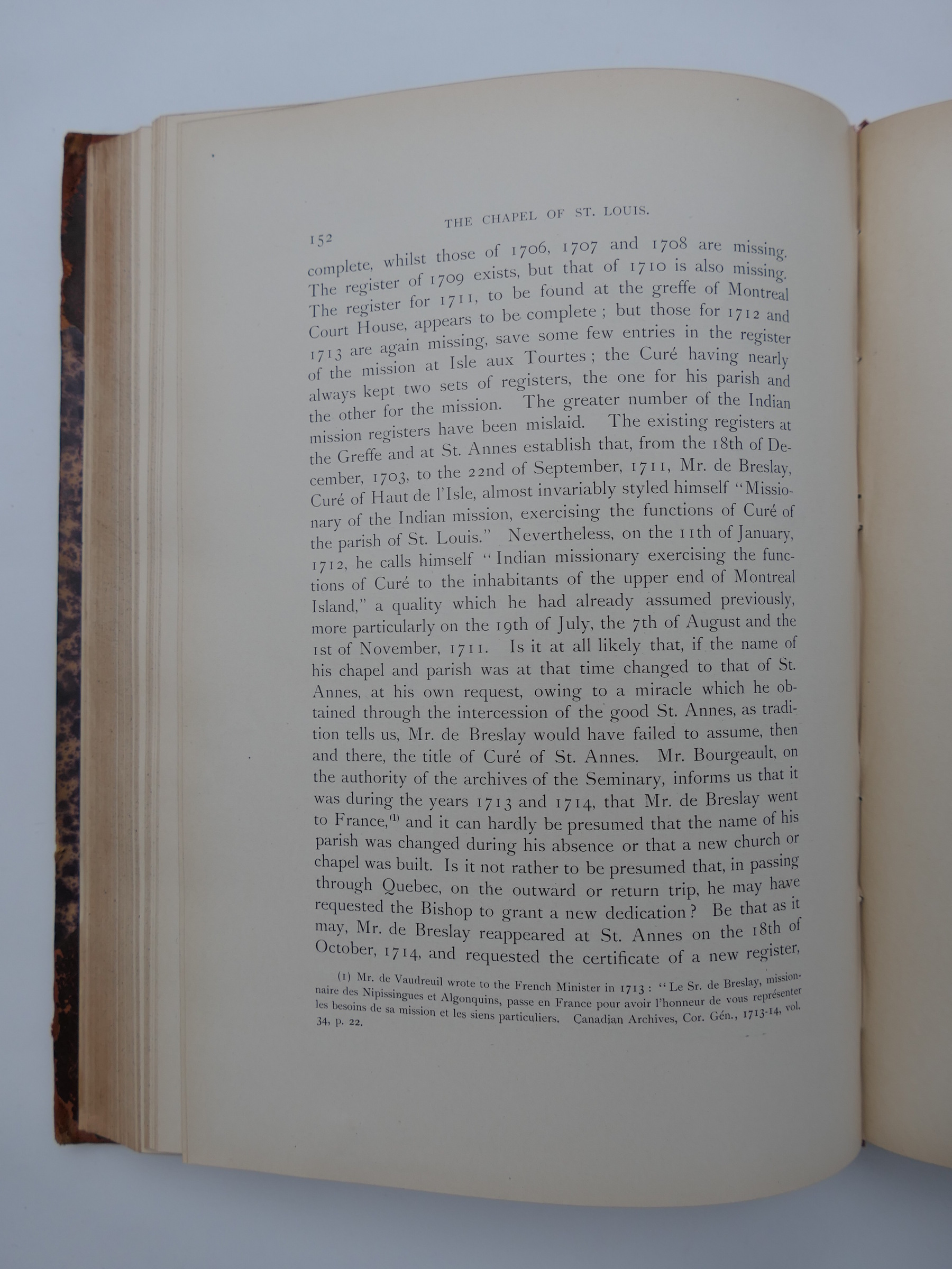 The register of 1709 exist, but that of 1710 is also missing. The register for 1711, to be found at the greffe of Montreal Court House, appears to be complete ; but those for 1712 and 1713 are again missing, save some few entries in the register of the mission at Isle aux Tourtes; the Curé having always kept two sets of registers, the one for his parish and the other for the mission. The greater number of the Indian mission registers have been mislaid. The existing registers at the Greffe and at St. Annes establish that, from the 18th of December, 1703, to the 22nd of September, 1711, Mr. de Breslay Curé of Haut de l'Isle, almost invariably styled himself "Missionary of the Indian mission, exercising the functions of Curé of the parish of St. Louis." Nevertheless, on the 11th of January 1712, he calls himself "Indian missionary exercising the functions of Curé to the inhabitants of the upper end of Montreal Island," a quality which he had already assumed previously, more particularly on the 19th of July, the 7th of August and the 1st of November, 1711. Is it at all likely that, if the name of his chapel and parish was at that time changed to that of St. Annes, at his own request, owing to a miracle which he obtained through the intercession of the good St. Annes, as tradition tells us, Mr. de Breslay would have failed to assume, then and there, the title of Curé of St. Annes. Mr. Bourgeault, on the authority of the archives of the Seminary, informs us that it was during the years 1713 and 1714, that Mr. de Breslay went to France,(1) and it can hardly be presumed that the name of parish was changed during his absence or that a new church or chapel was built. Is it not rather to be presumed that, in passing through Quebec, on the outward or return trip, he may have requested the Bishop to grant a new dedication? Be that as it may, Mr. de Breslay reappeared at St. Annes on the 18th of October, 1714, and requested the certificate of a new register.