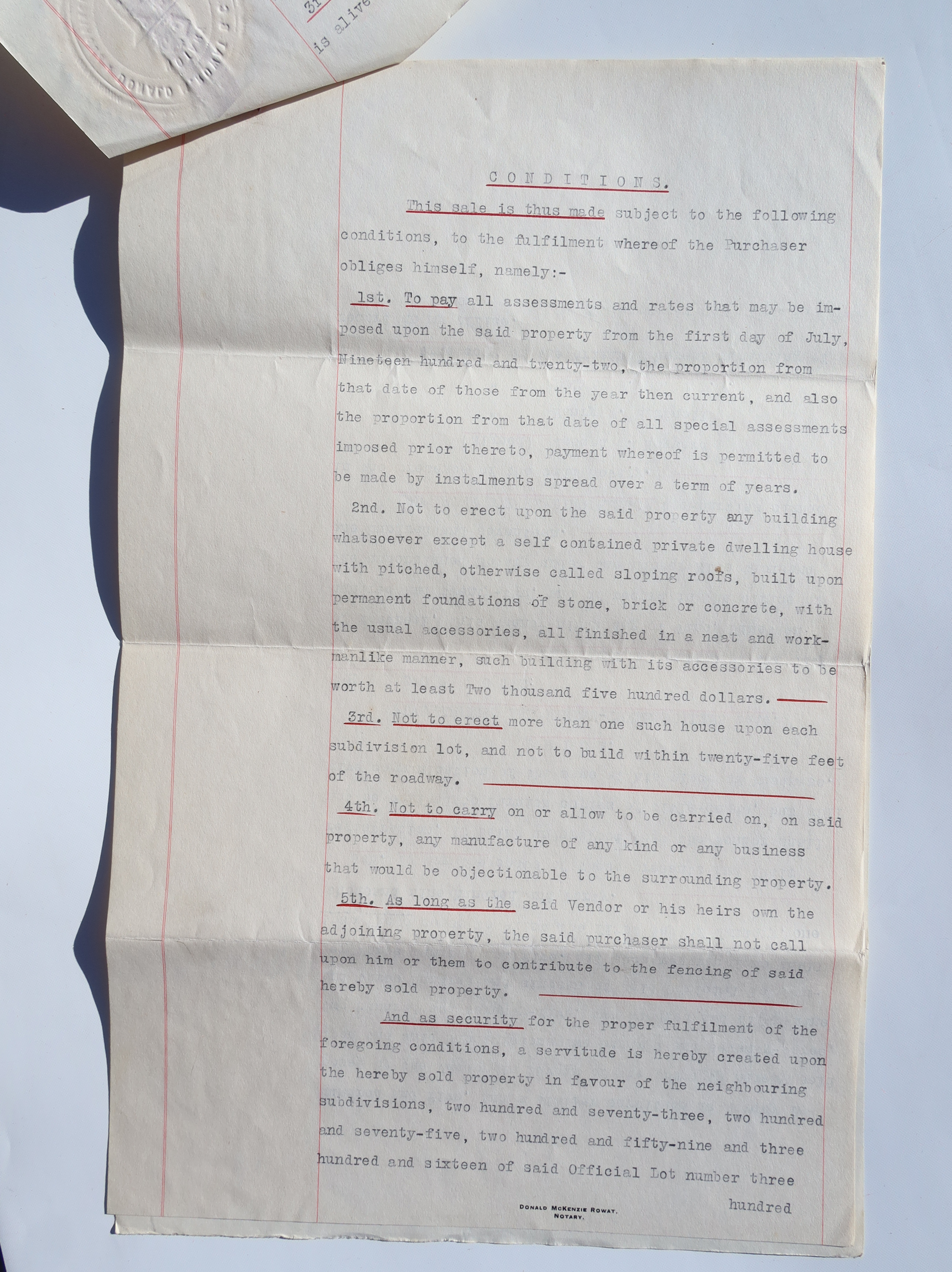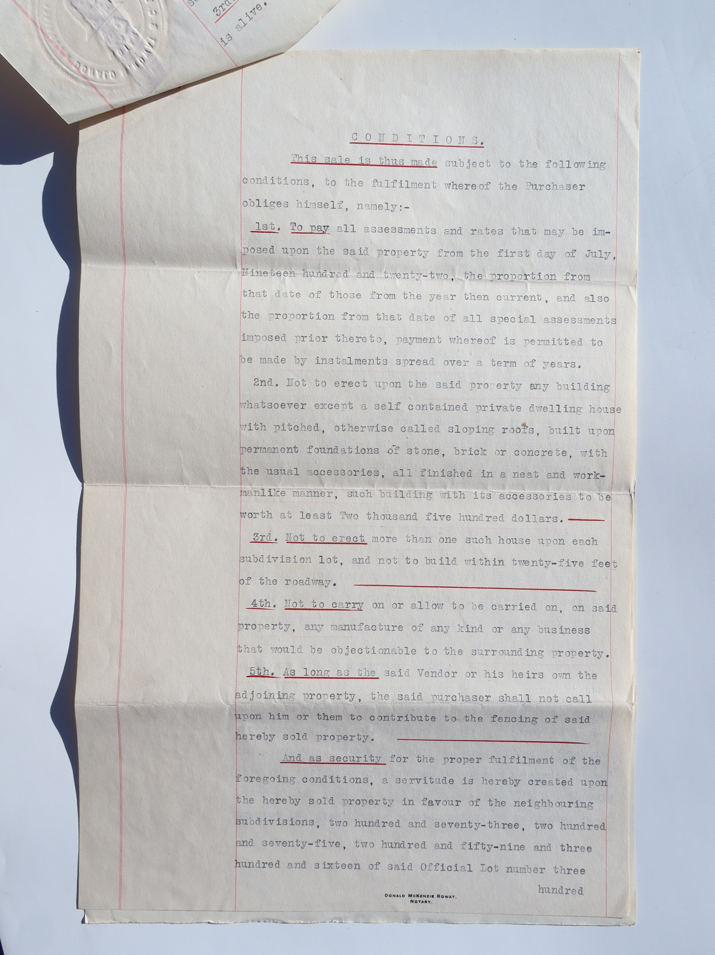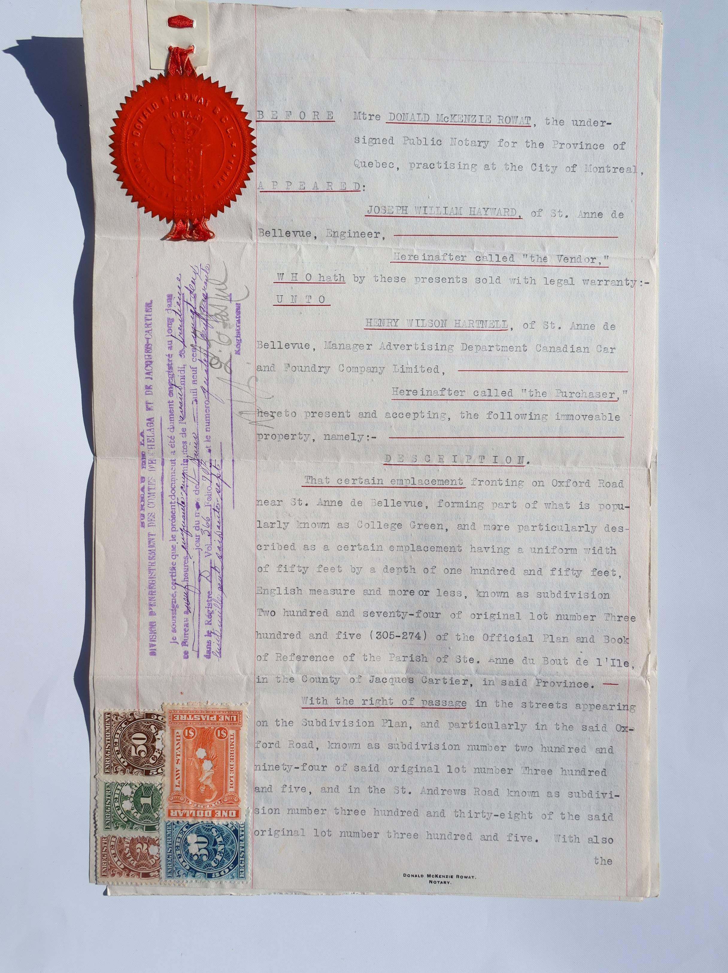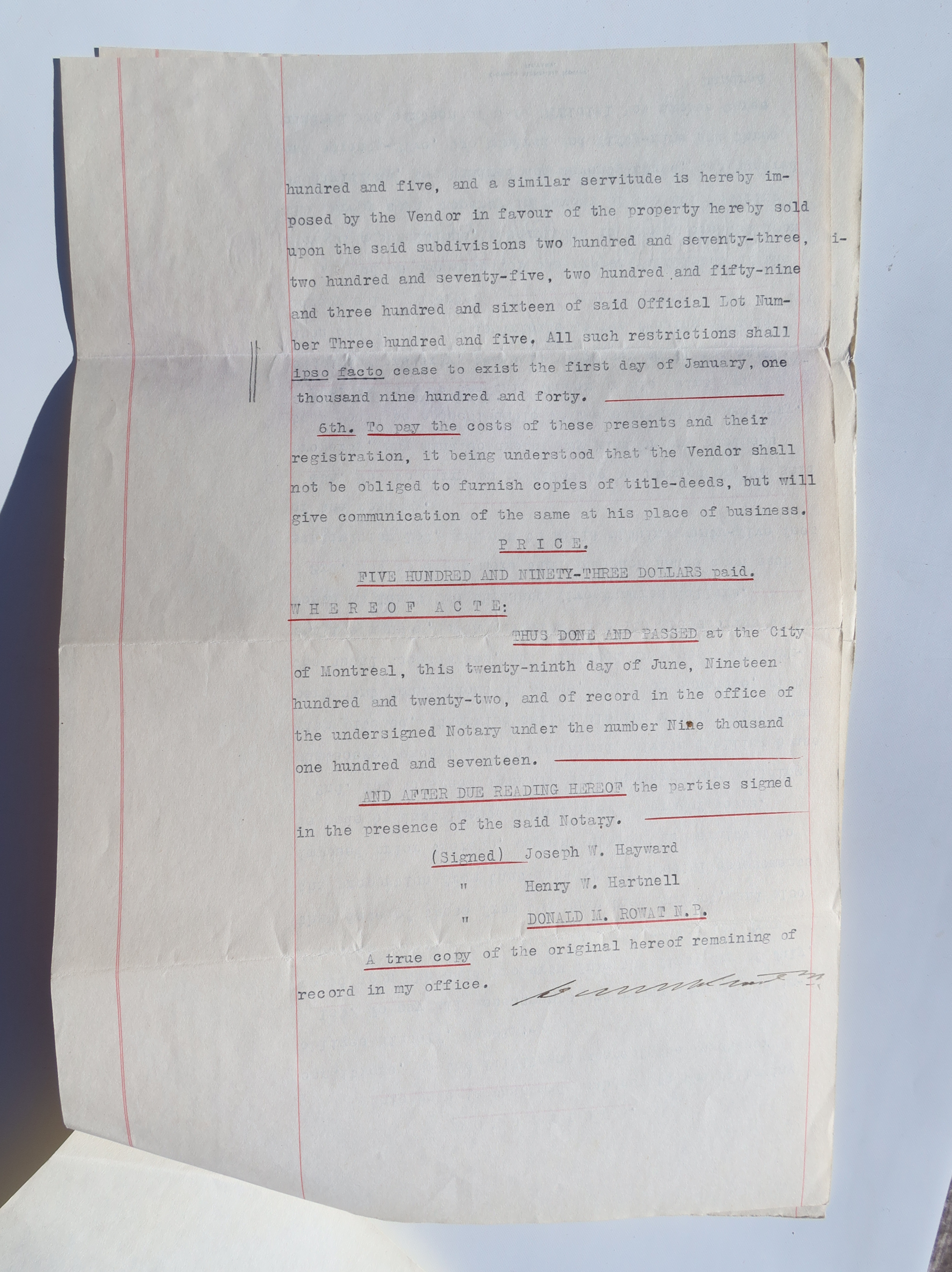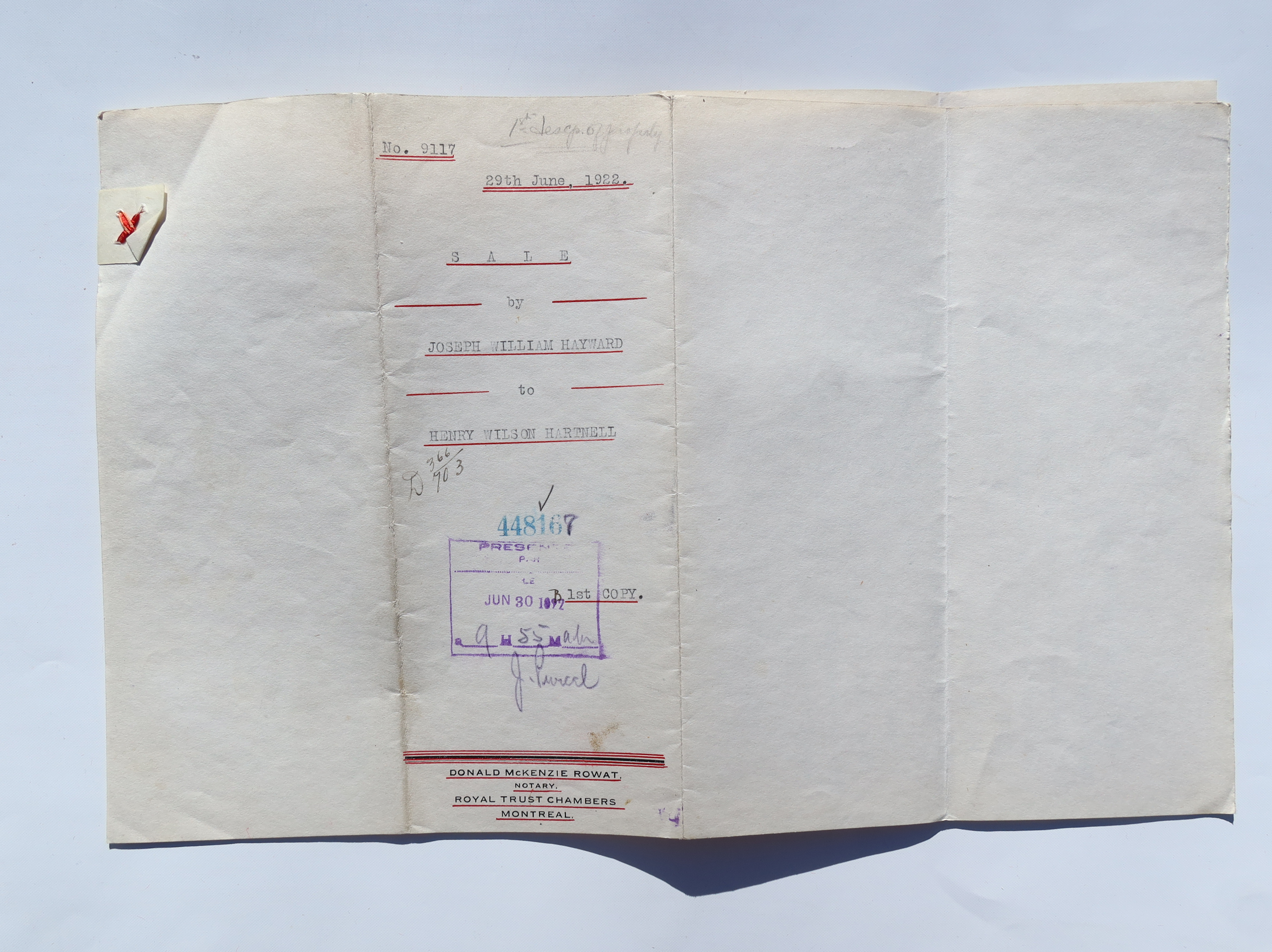 Sale by Joseph William Hayward to Henry Wilson Hartnell, signed June 29, 1922.