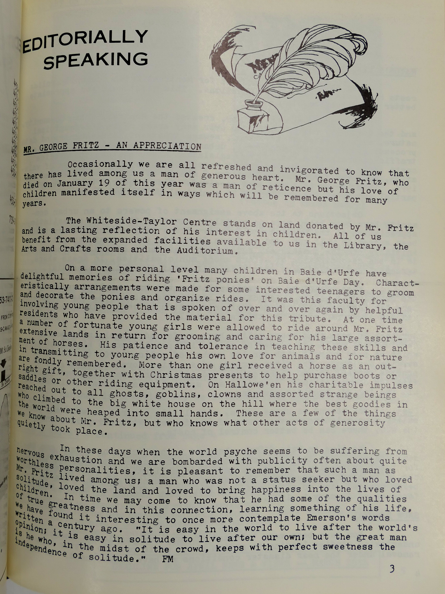 In these days when the world psyche seems to be suffering from nervous exhaustion and we are bombarded with publicity about often quite worthless personalities, it is pleasant to remember that such a man as Mr. Fritz lived among us; a man who was not a status seeker but who loved solitude, loved the land and loved to bring happiness into the lives of children. In time we may come to know that he had some of the qualities of true greatness and in this connection, learning something of his life, we have found it interesting to once more contemplate Emerson's words written a century ago. "It is easy in the world to live after the world's opinion; it is easy in solitude to live after our own; but the great man is he who, in the midst of the crowd, keeps with perfect sweetness the independence of solitude."