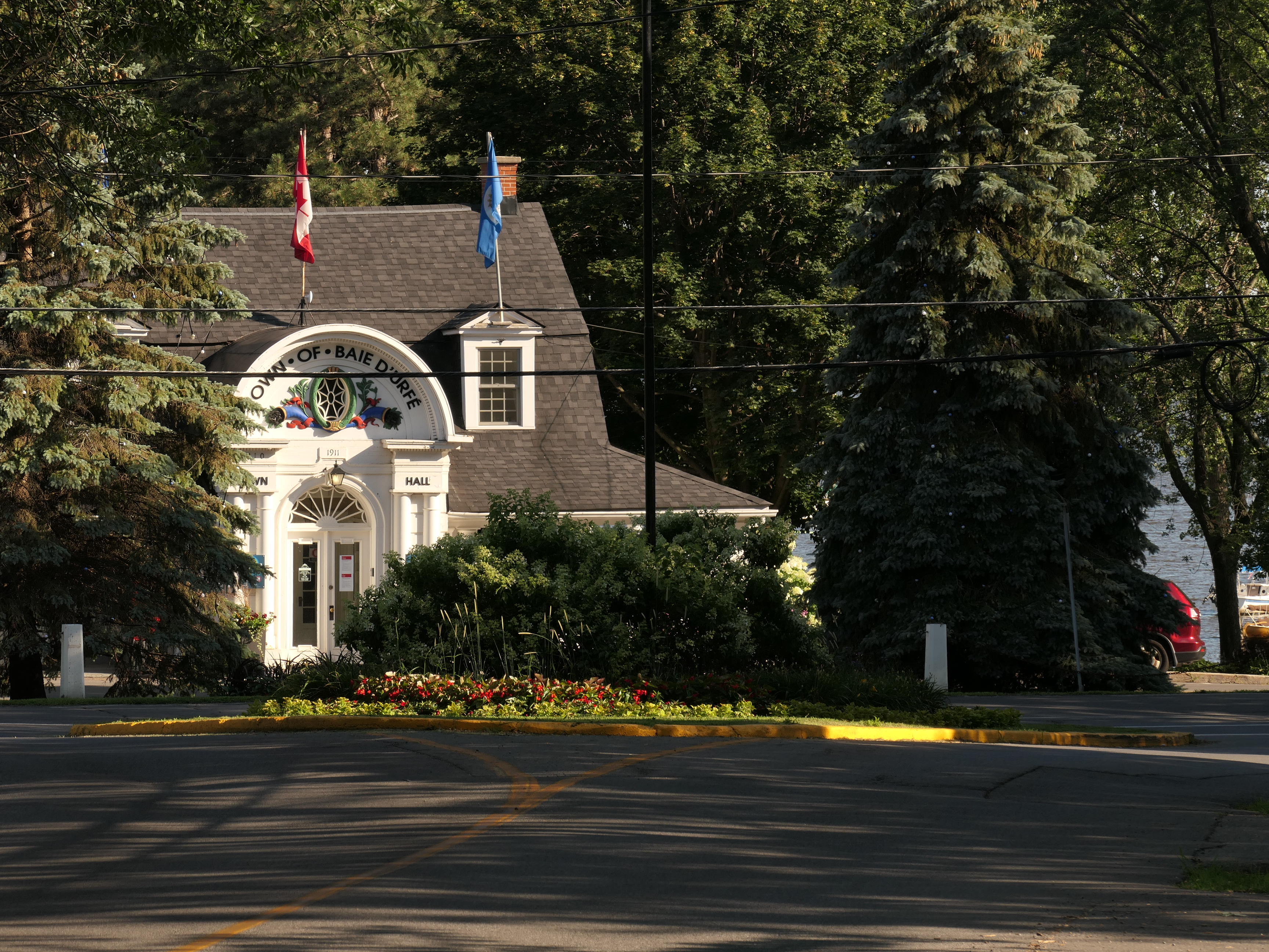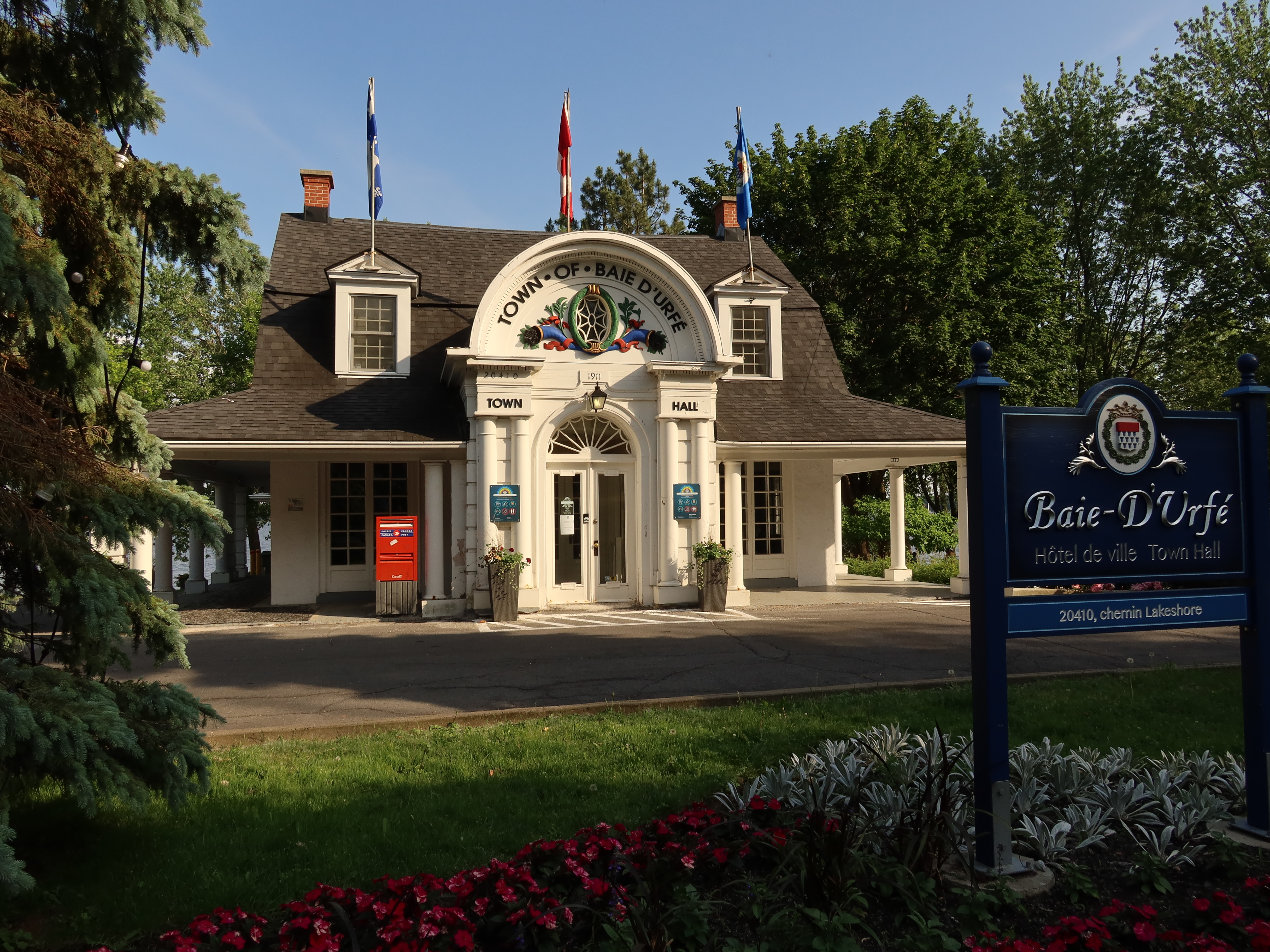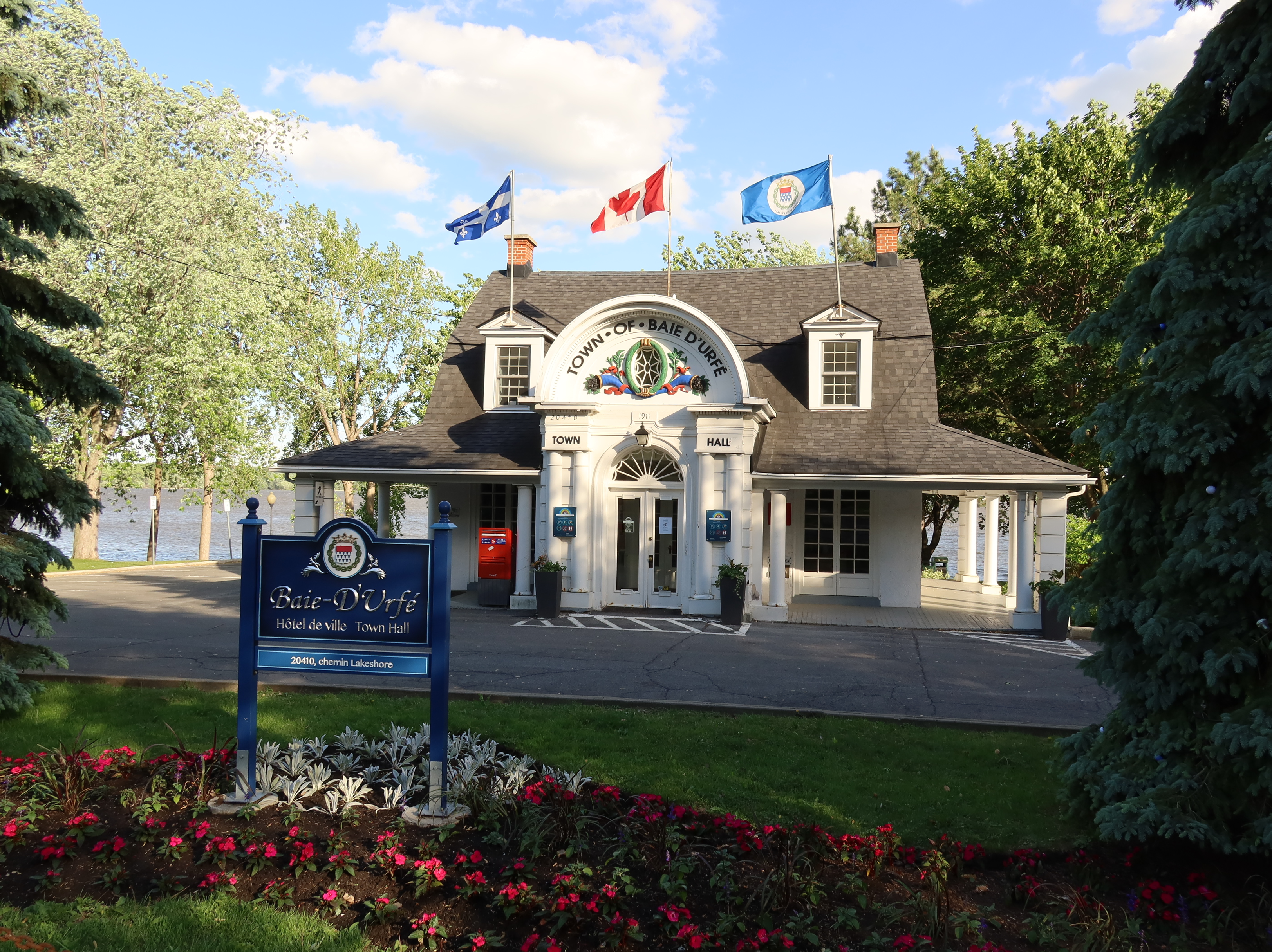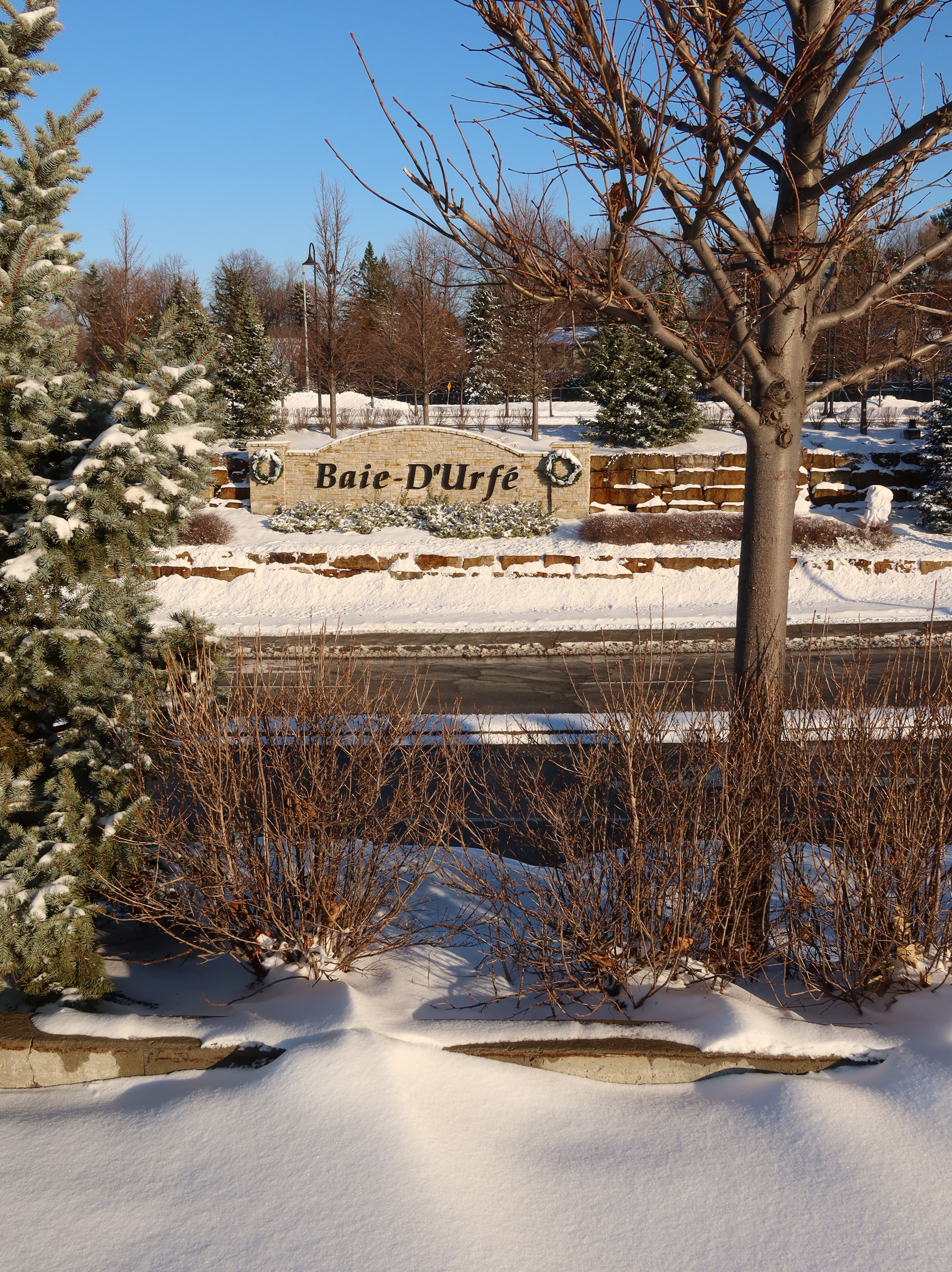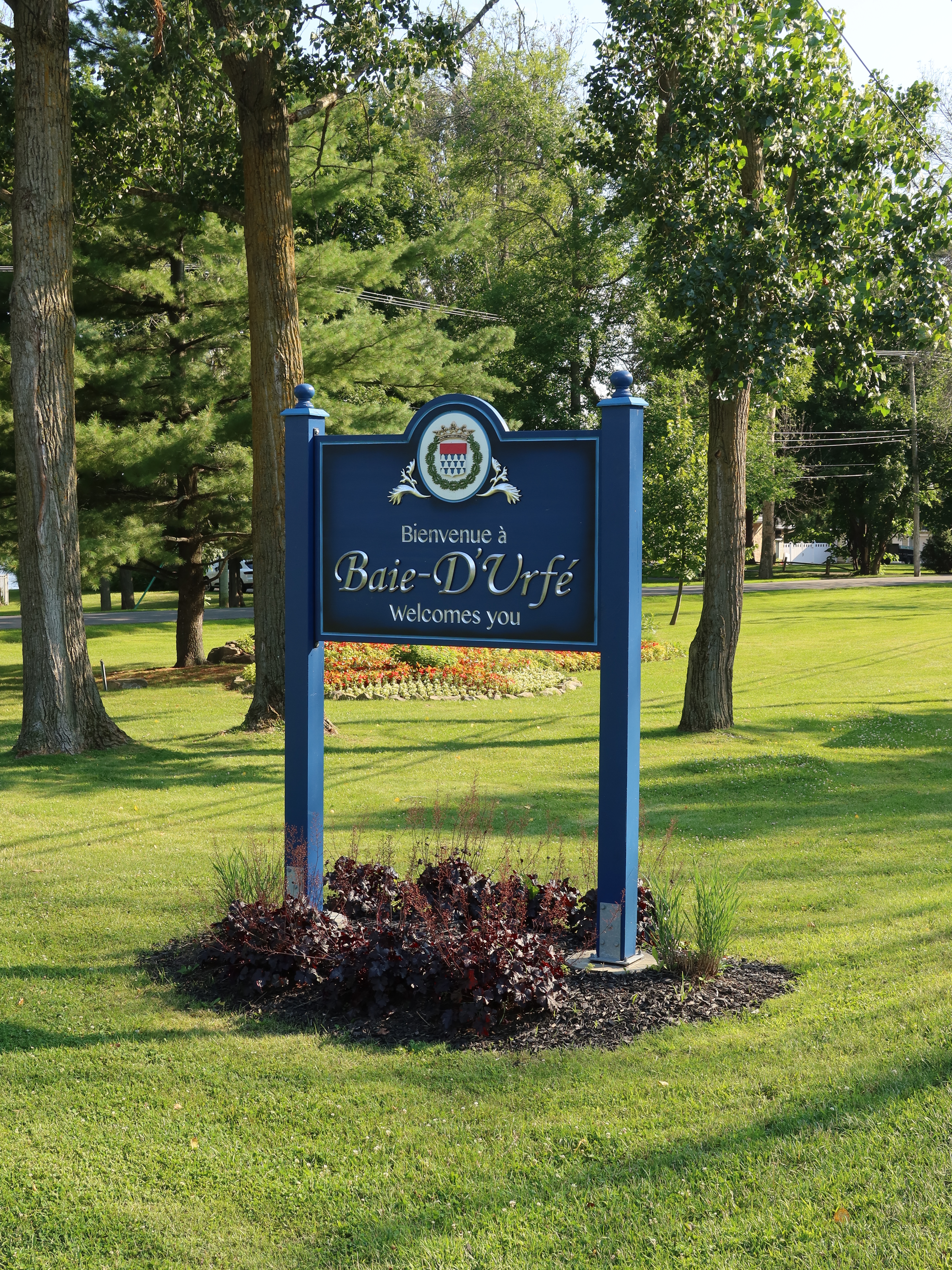 A much nicer entrance area was designed to mark Baie-D'Urfé's 100th year of incorporation. This new entrance with flowers, trees, and natural stone boulders was inaugurated on Sunday, June 19, 2011, by Mayor Maria Tutino.