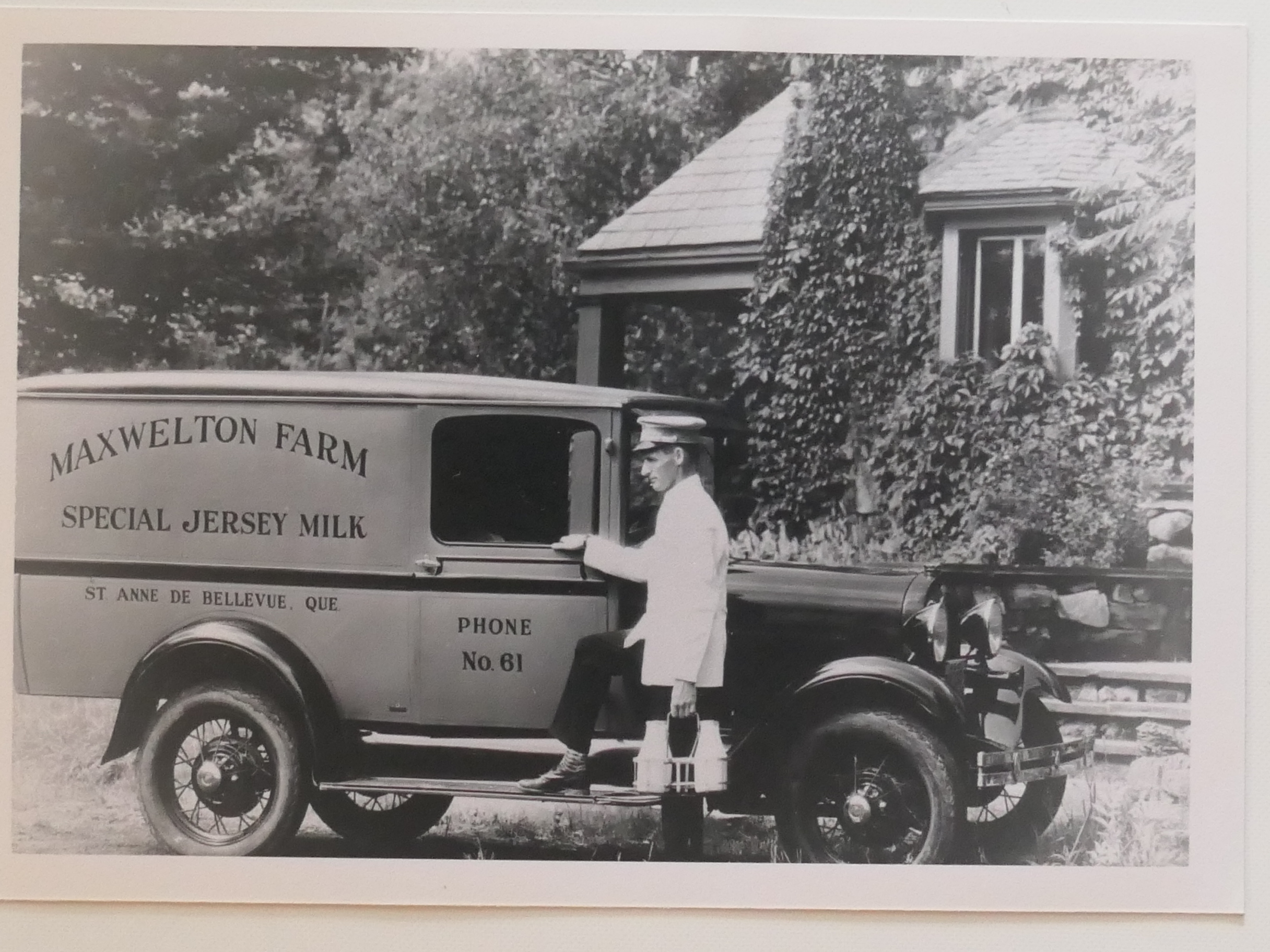 Maxwelton delivery van with Mr. Gordon Poole in 1930. Phone number 61 was the Maxwelton farmhouse in Baie-D’Urfé. It says "ST ANNE DE BELLEVUE" on the van and it could be that this is because of the phone number. Baie-D’Urfé was part of the switchboard in St-Anne.