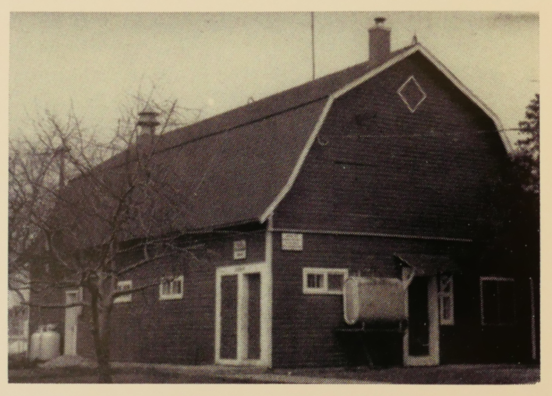 Fritz Farm barn, the farm manager's house can be seen in the back. Photo from the late 1950s. The barn was painted in blue.