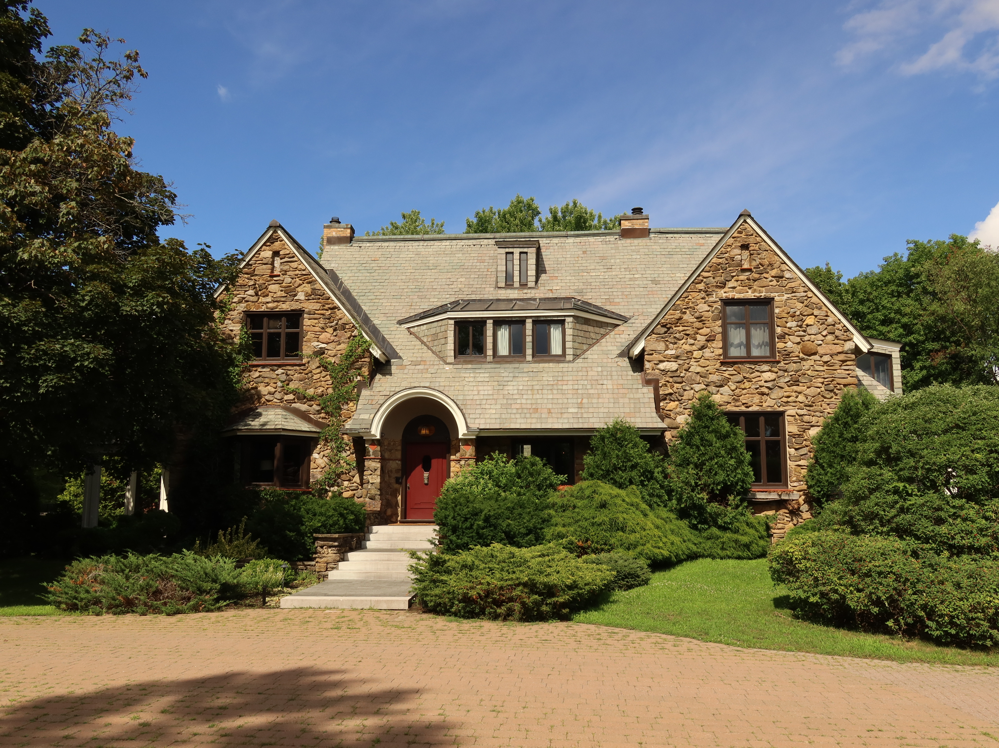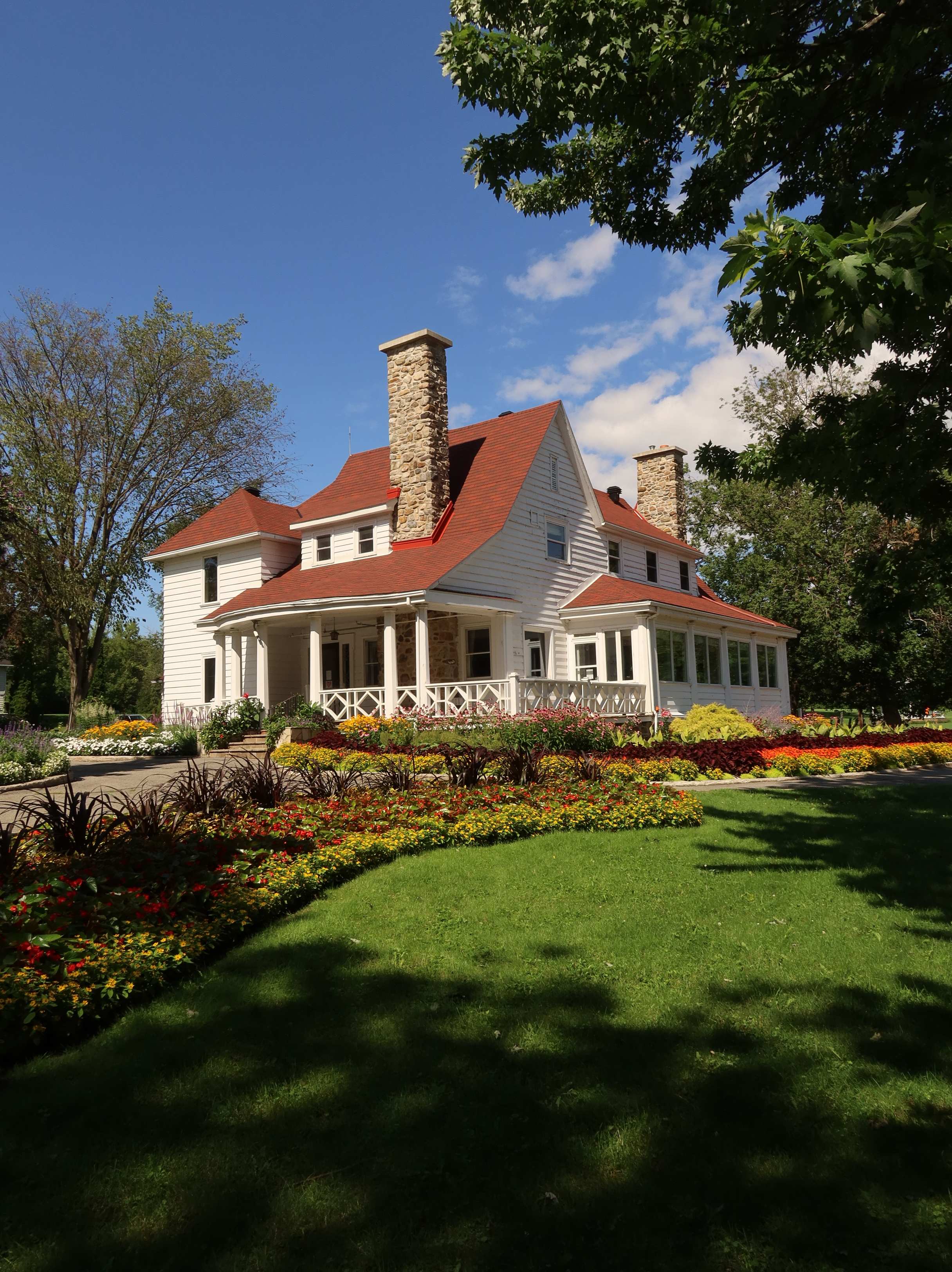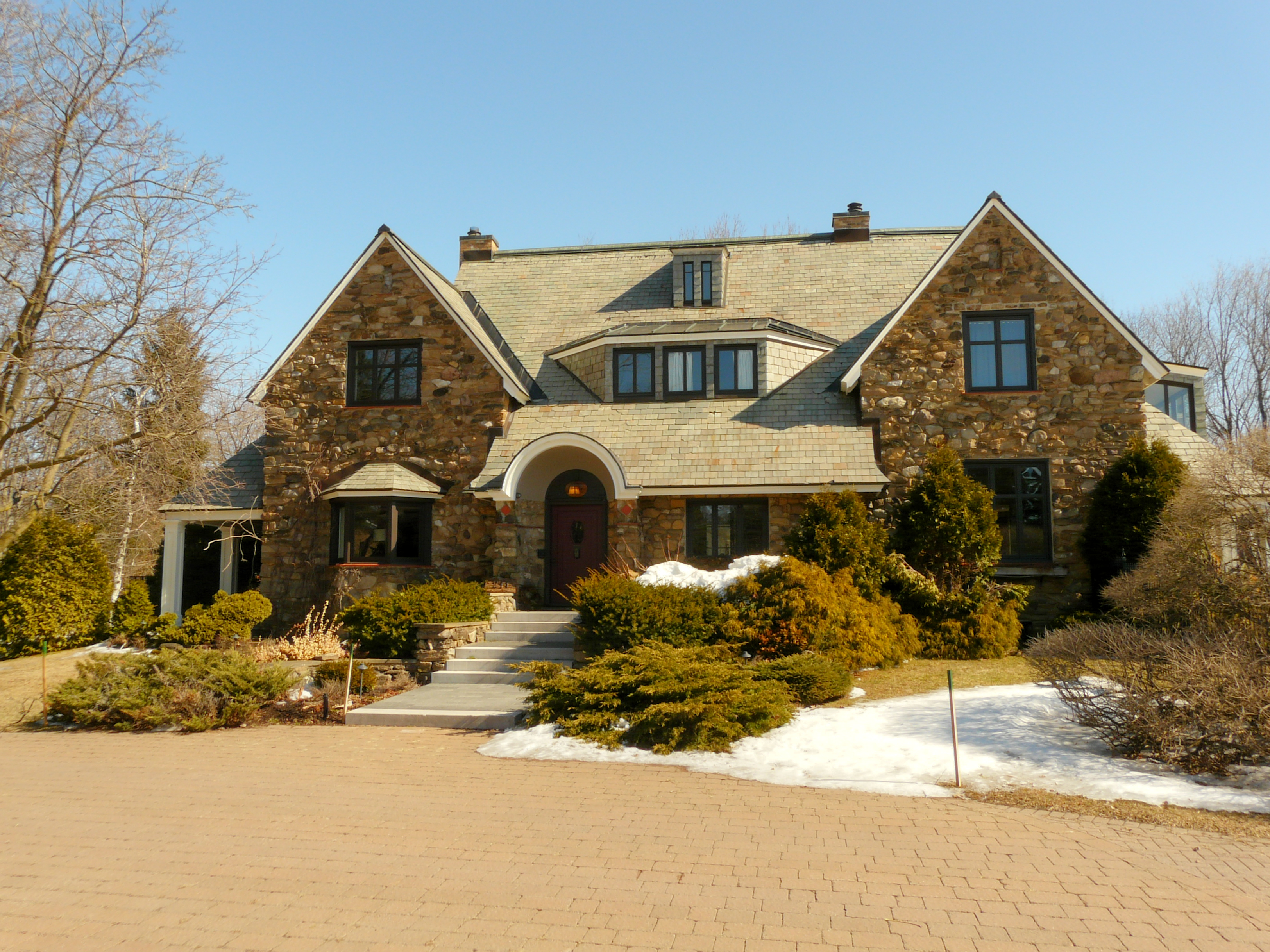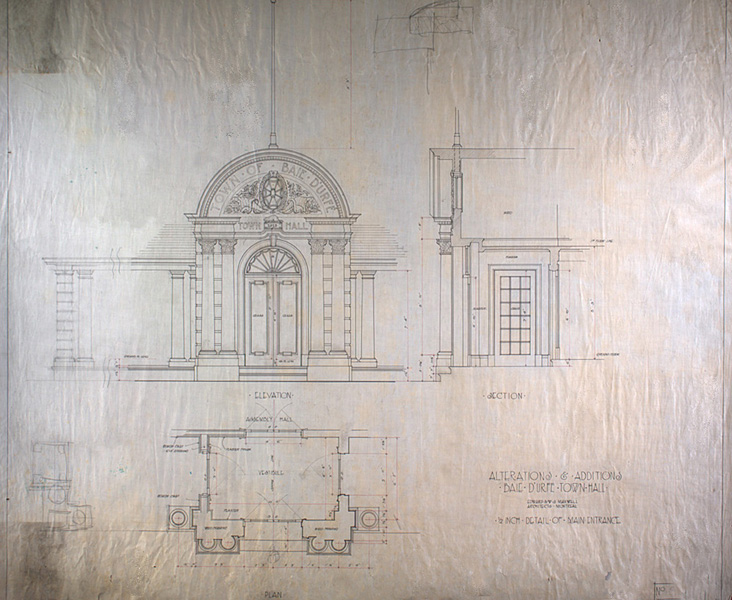 Edward Maxwell used a very interesting design principle for both the Maxwelton and the Baie-D'Urfé Town Hall (see further down). The buildings have corners and pointed roof sections but the roof above the main entrance is round. This idea is taken from nature. Most of us understand it intuitively without being aware of it. The fruits on a fruit tree are round. Animals and humans should go to them and are indeed attracted to them. Other parts are pointed, sometimes even thorny. Think of flowers that have colorful round shapes to attract bees and butterflies while the green leaves are often pointed, sometimes with hard edges or even thorns. On the Maxwelton building the main entrance is not only round but the door has even a dark red color, like a ripe fruit or a flower. Visitors are intuitively guided towards it. It becomes a design that we like without really being fully aware of it and it is because of the design's consistency with the nature around us.