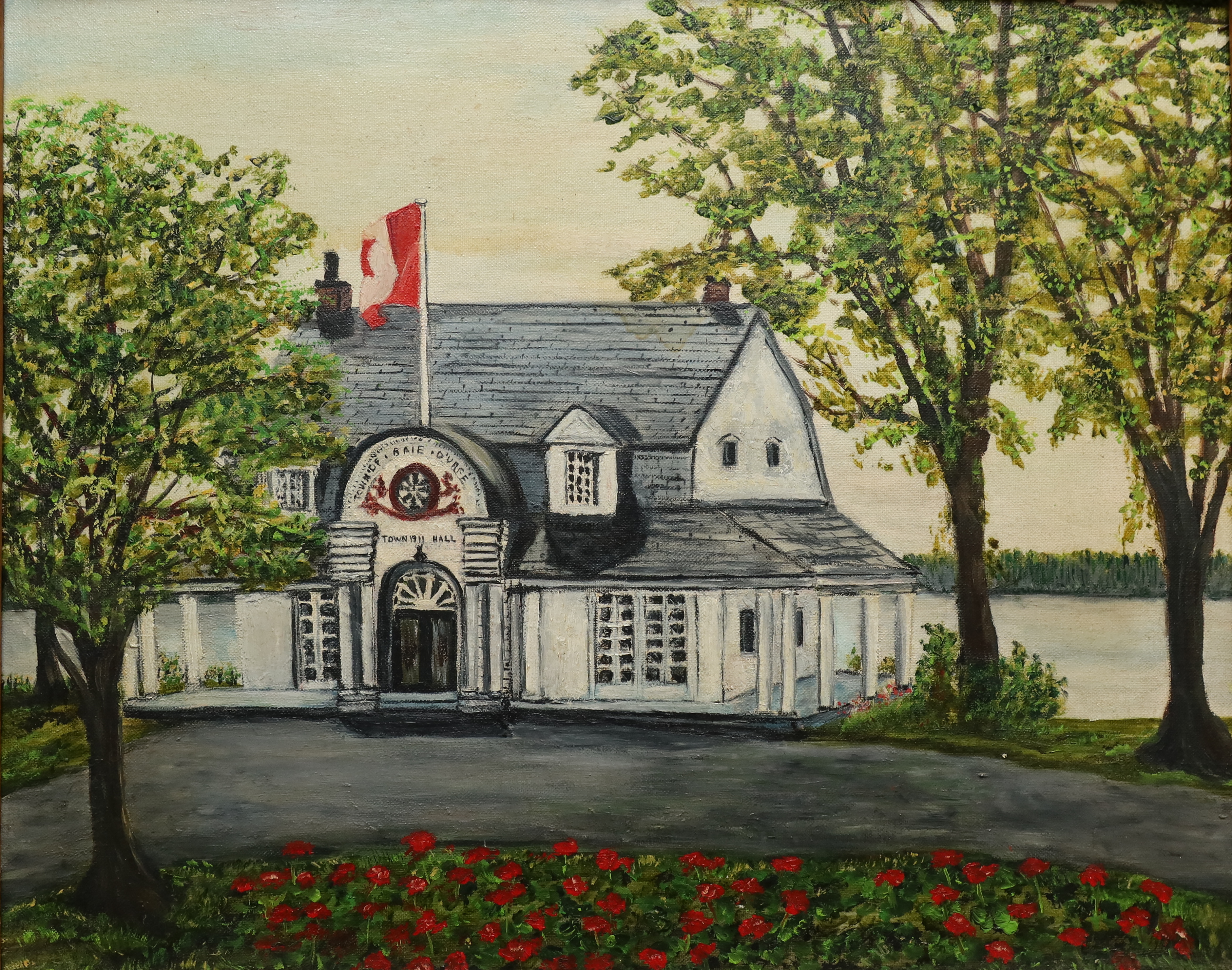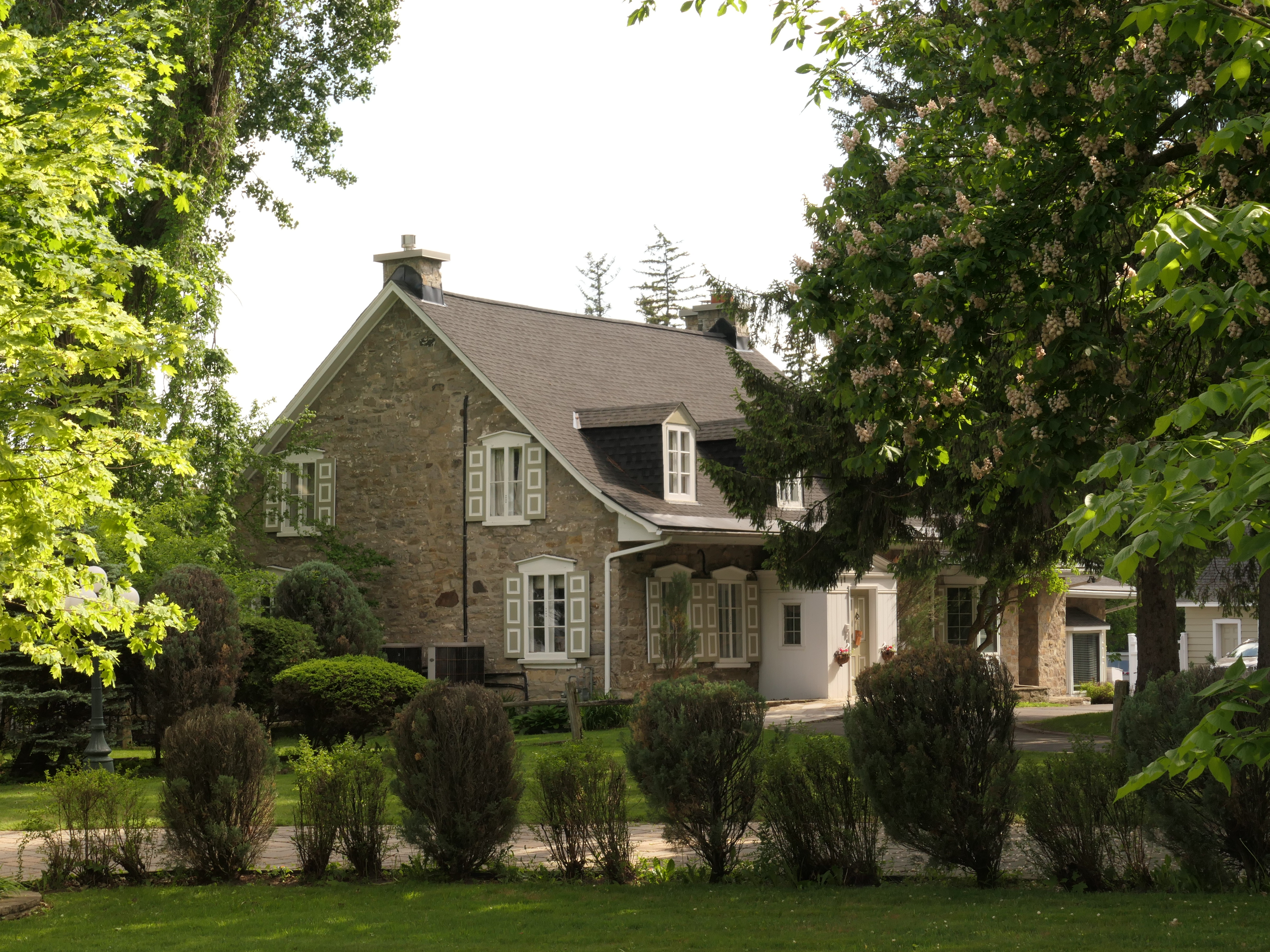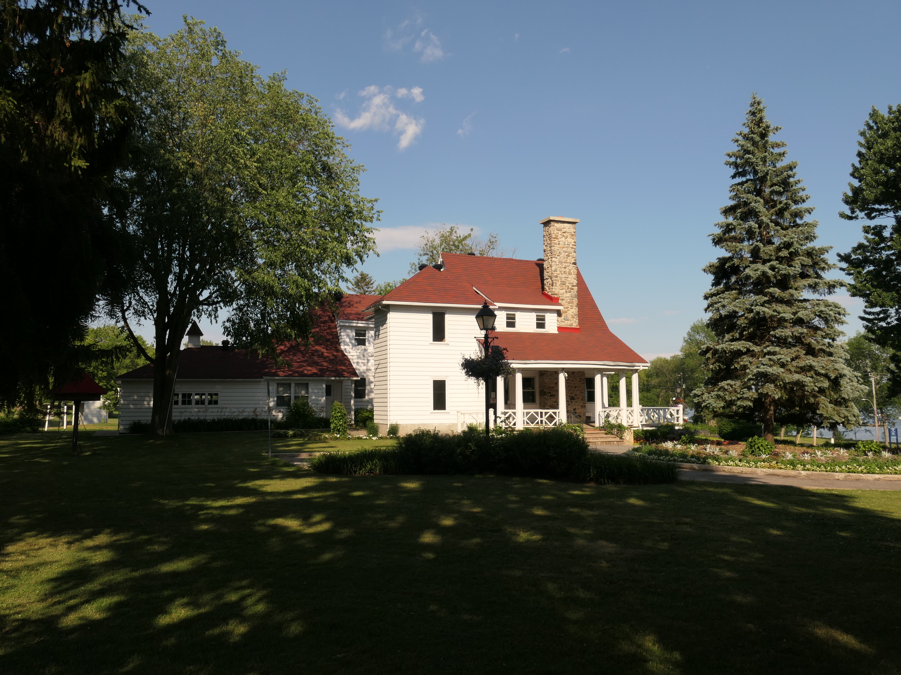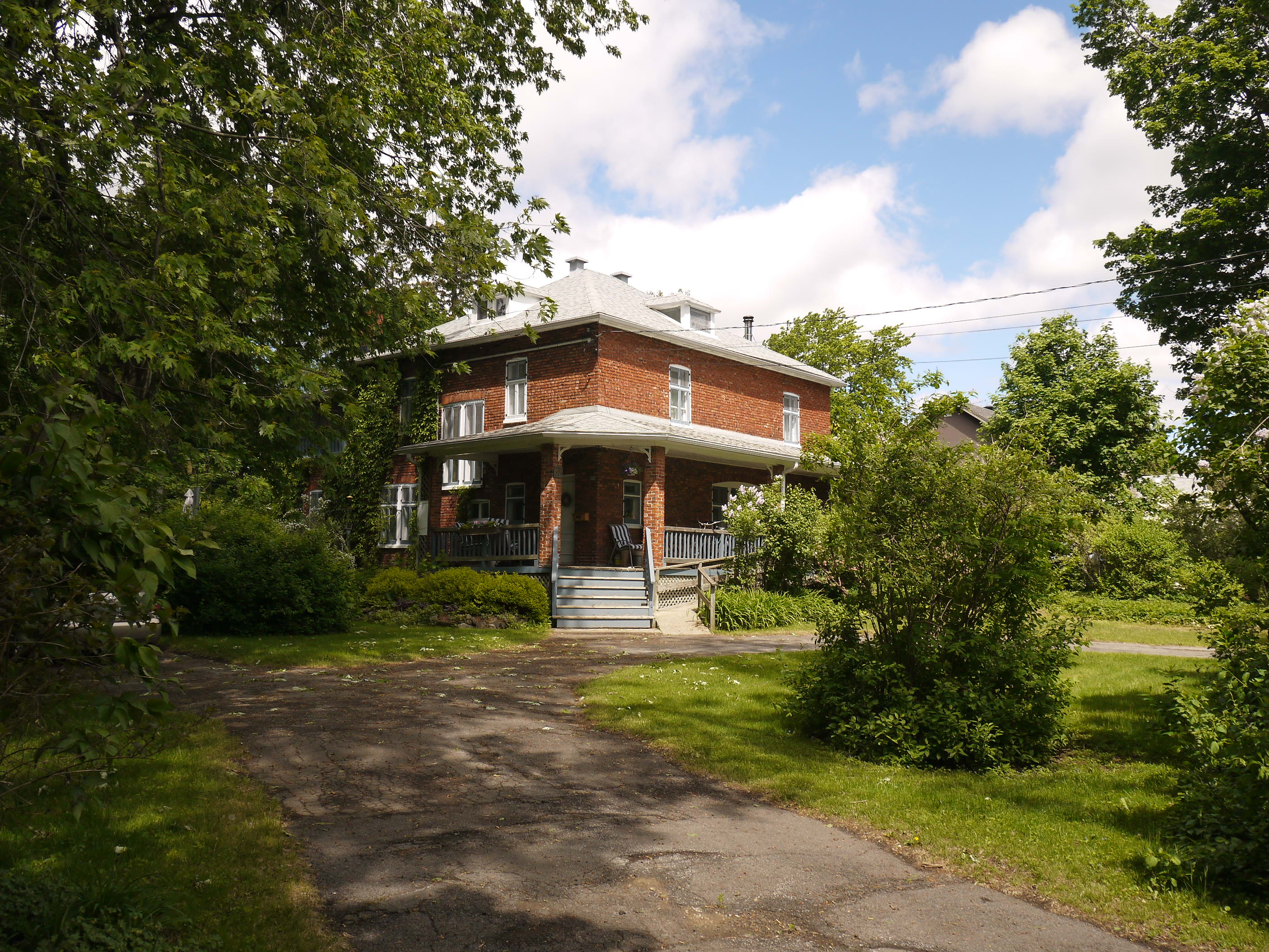 Edward Maxwell used a very interesting design principle for both the Maxwelton and the Baie-D'Urfé Town Hall (see further down). The buildings have corners and pointed roof sections but the roof above the main entrance is round. This idea is taken from nature. Most of us understand it intuitively without being aware of it. The fruits on a fruit tree are round. Animals and humans should go to them and are indeed attracted to them. Other parts are pointed, sometimes even thorny. Think of flowers that have colorful round shapes to attract bees and butterflies while the green leaves are often pointed, sometimes with hard edges or even thorns. On the Maxwelton building the main entrance is not only round but the door has even a dark red color, like a ripe fruit or a flower. Visitors are intuitively guided towards it. It becomes a design that we like without really being fully aware of it and it is because of the design's consistency with the nature around us.
