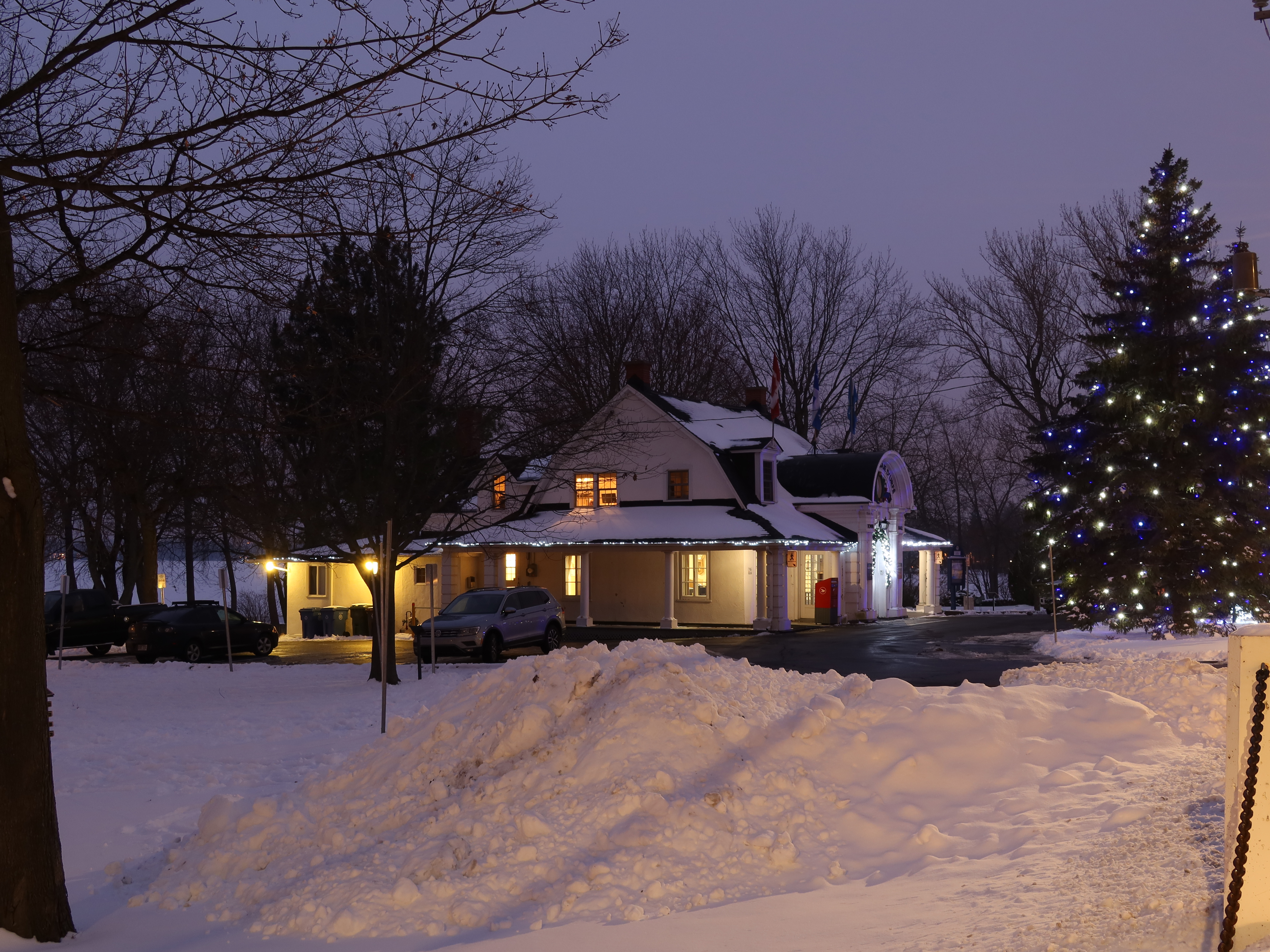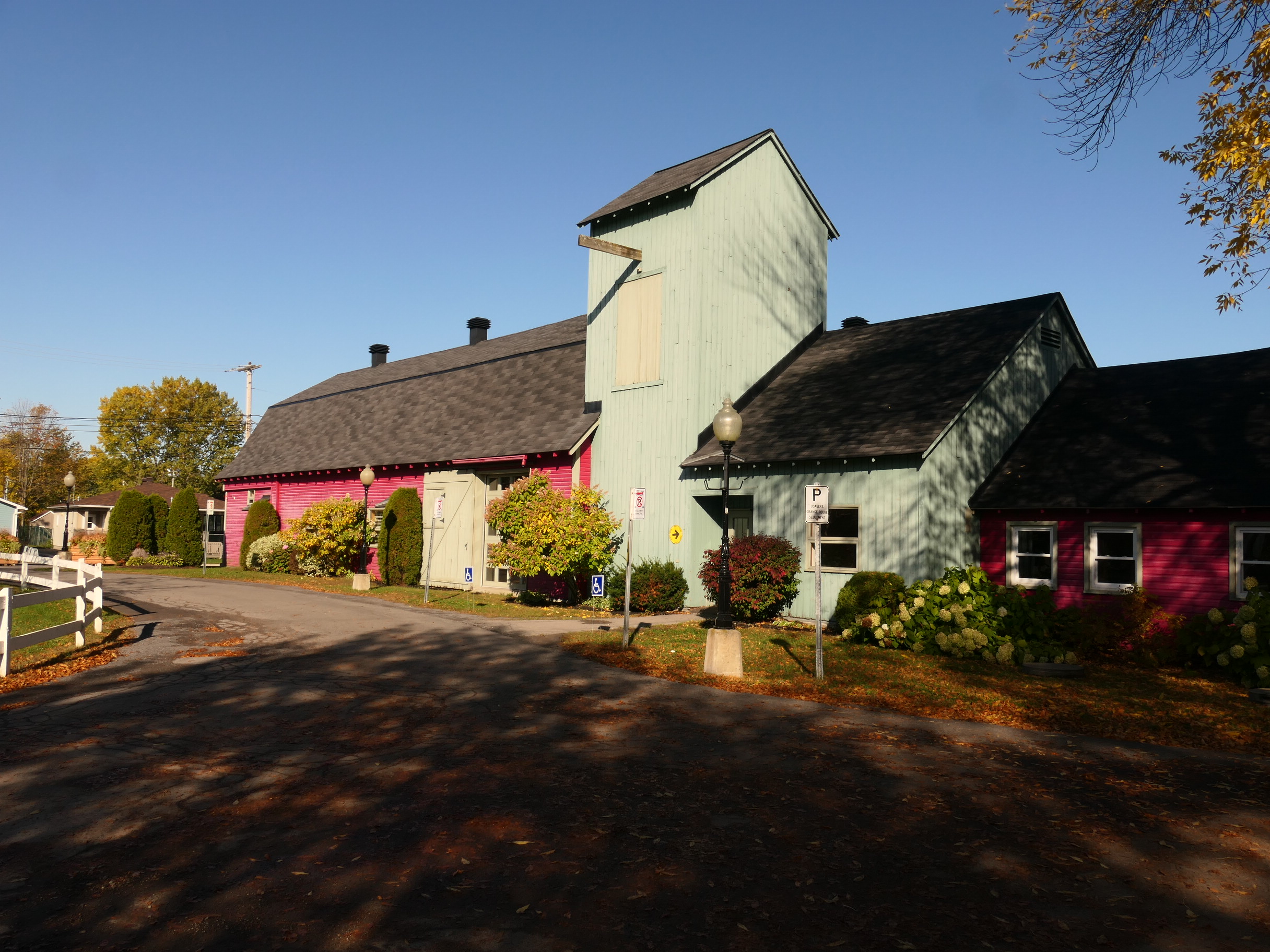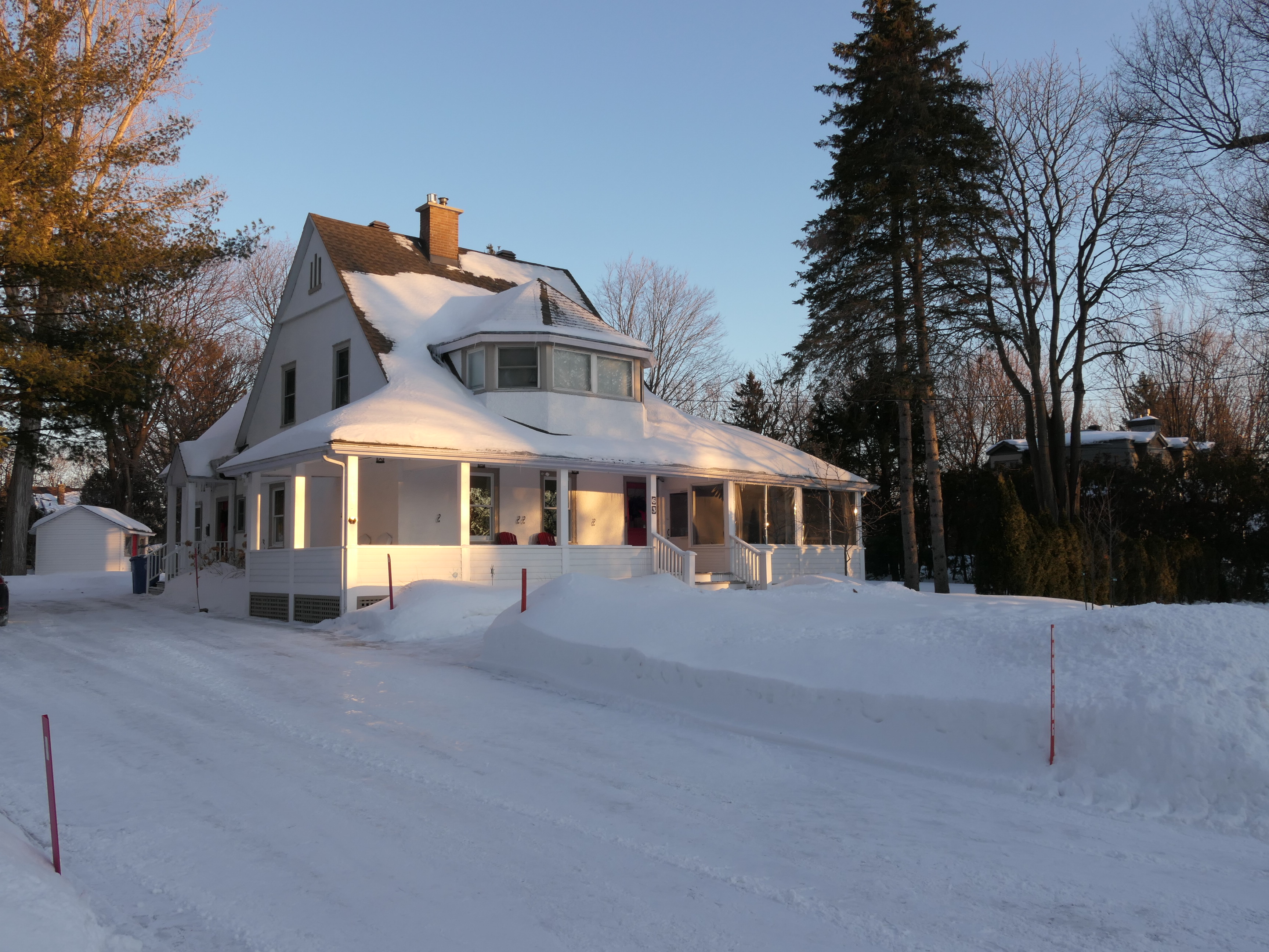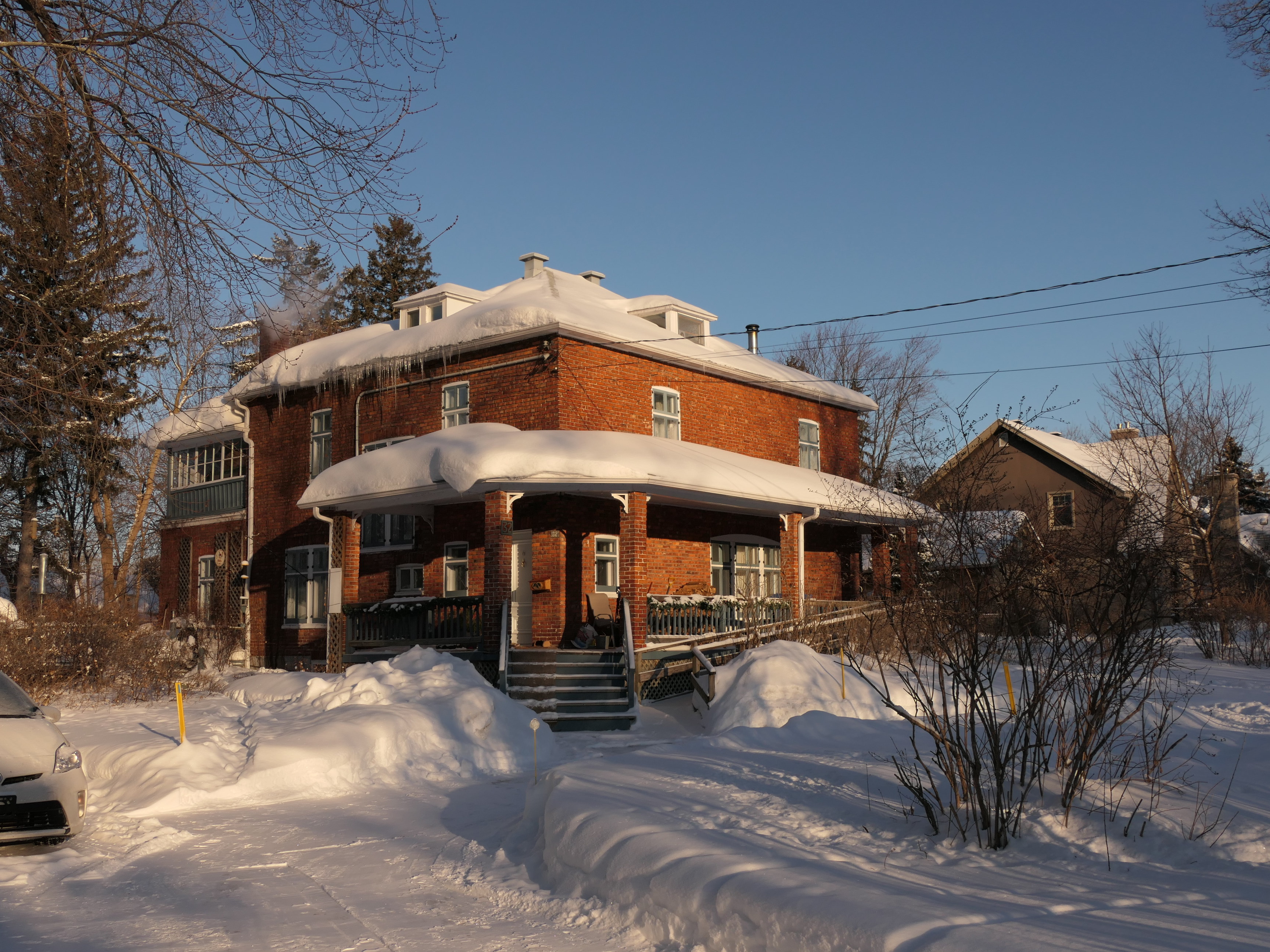 Edward Maxwell used a very interesting design principle for both the Maxwelton and the Baie-D'Urfé Town Hall (see further down). The buildings have corners and pointed roof sections but the roof above the main entrance is round. This idea is taken from nature. Most of us understand it intuitively without being aware of it. The fruits on a fruit tree are round. Animals and humans should go to them and are indeed attracted to them. Other parts are pointed, sometimes even thorny. Think of flowers that have colorful round shapes to attract bees and butterflies while the green leaves are often pointed, sometimes with hard edges or even thorns. On the Maxwelton building the main entrance is not only round but the door has even a dark red color, like a ripe fruit or a flower. Visitors are intuitively guided towards it. It becomes a design that we like without really being fully aware of it and it is because of the design's consistency with the nature around us.