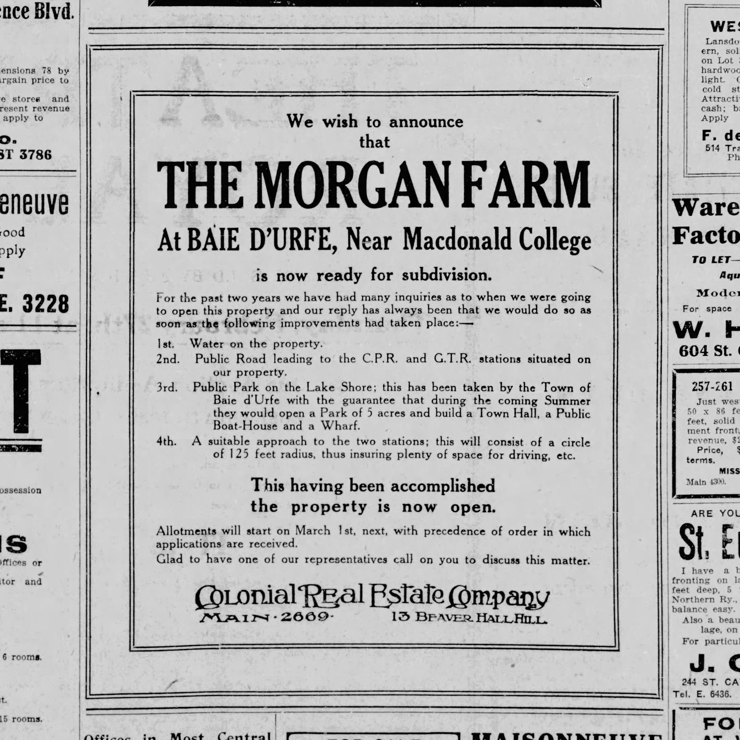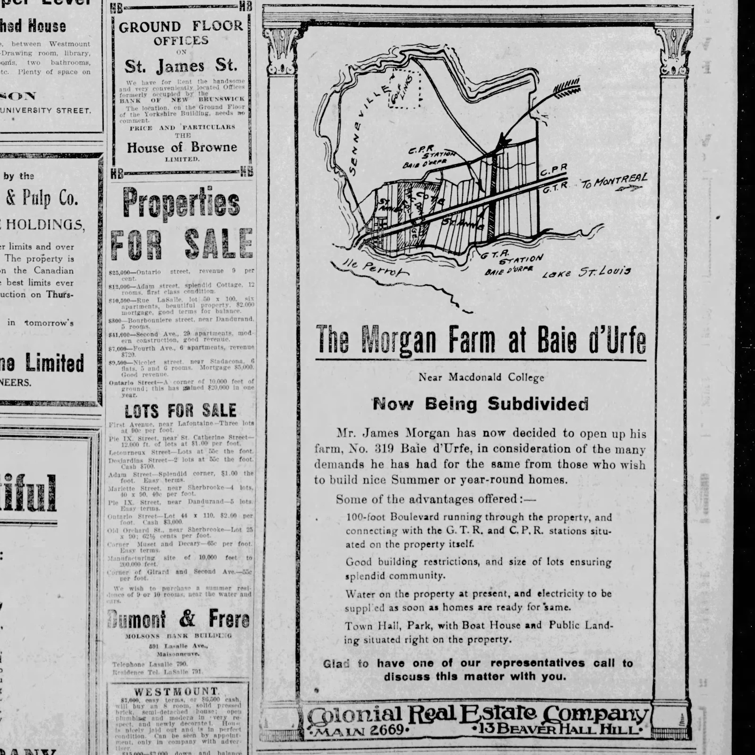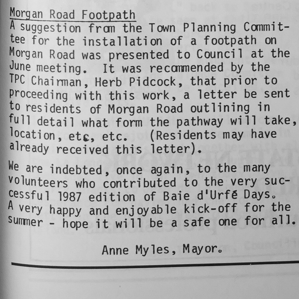 Charles St Denis opened in 1881 a path on his land to allow farmers in the area to bring goods to the railway. James Morgen bought in 1909 the Charles St Denis farm and built in 1913 a proper road with sidewalks from town hall up to the railway.