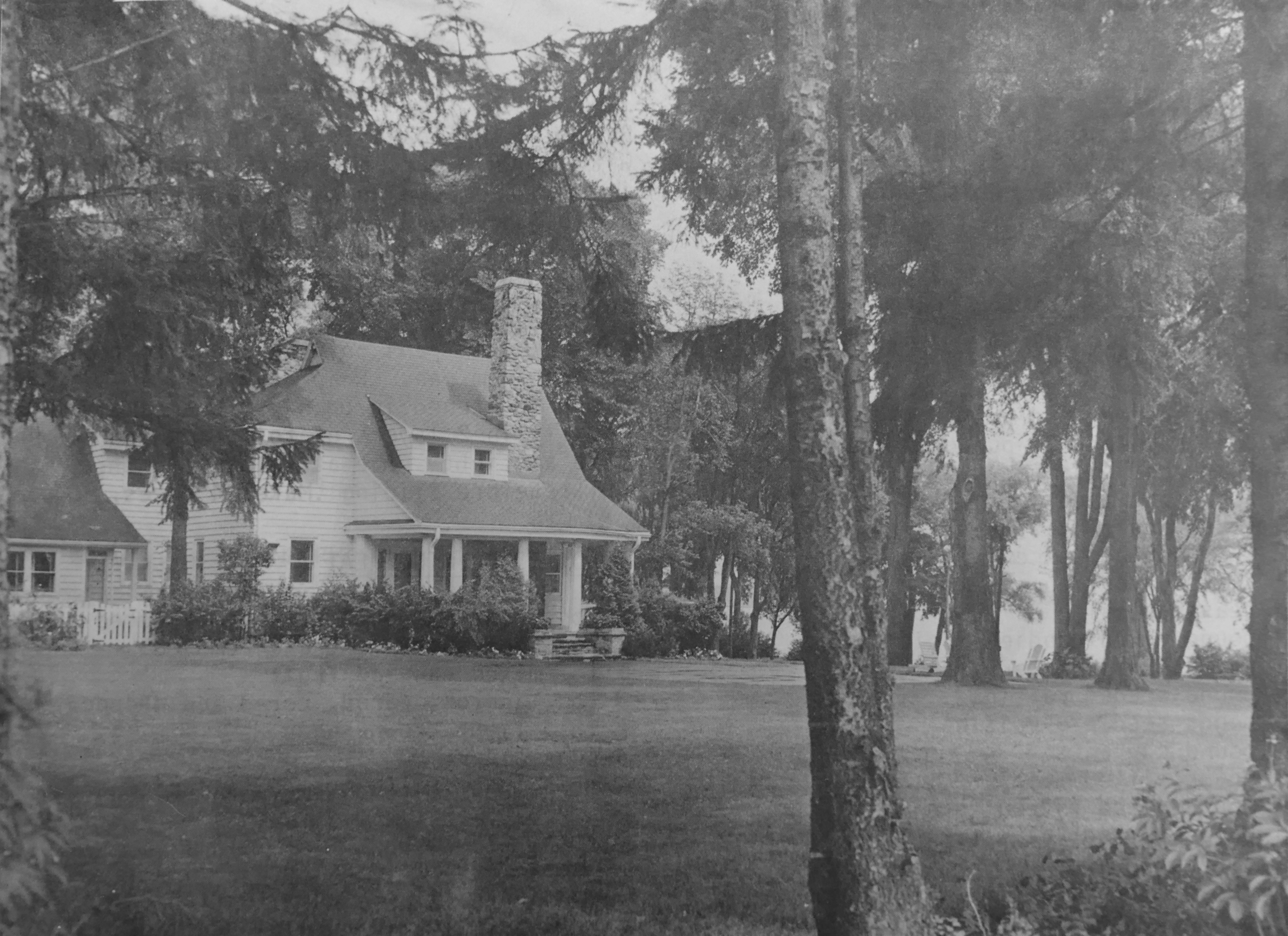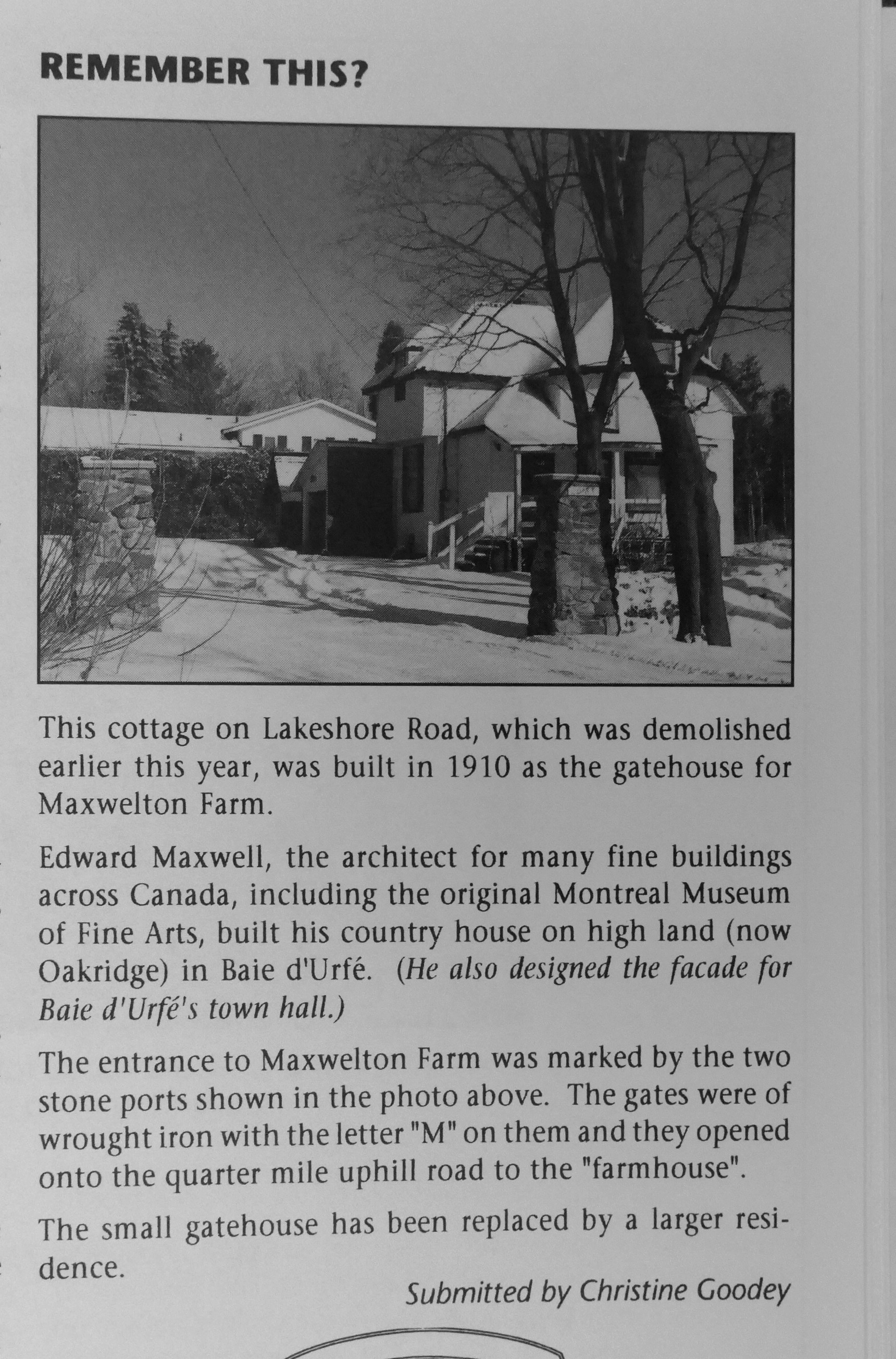 Most of the houses in the eastern part of Baie-D'Urfé were only built around 1960 and 1970. The farm of architect Edward Maxwell used to be in this area. It was known as the Maxwelton Dairy Farm. Mr. Maxwell died in 1923 but the farm continued under professional management until 1939, when daughter Elizabeth (1908-1969) returned with her husband Christopher Montagu Yates (known as Monty, 1899-1984) and the twin boys, Ted and Henry, to live year-round in the big farmhouse.