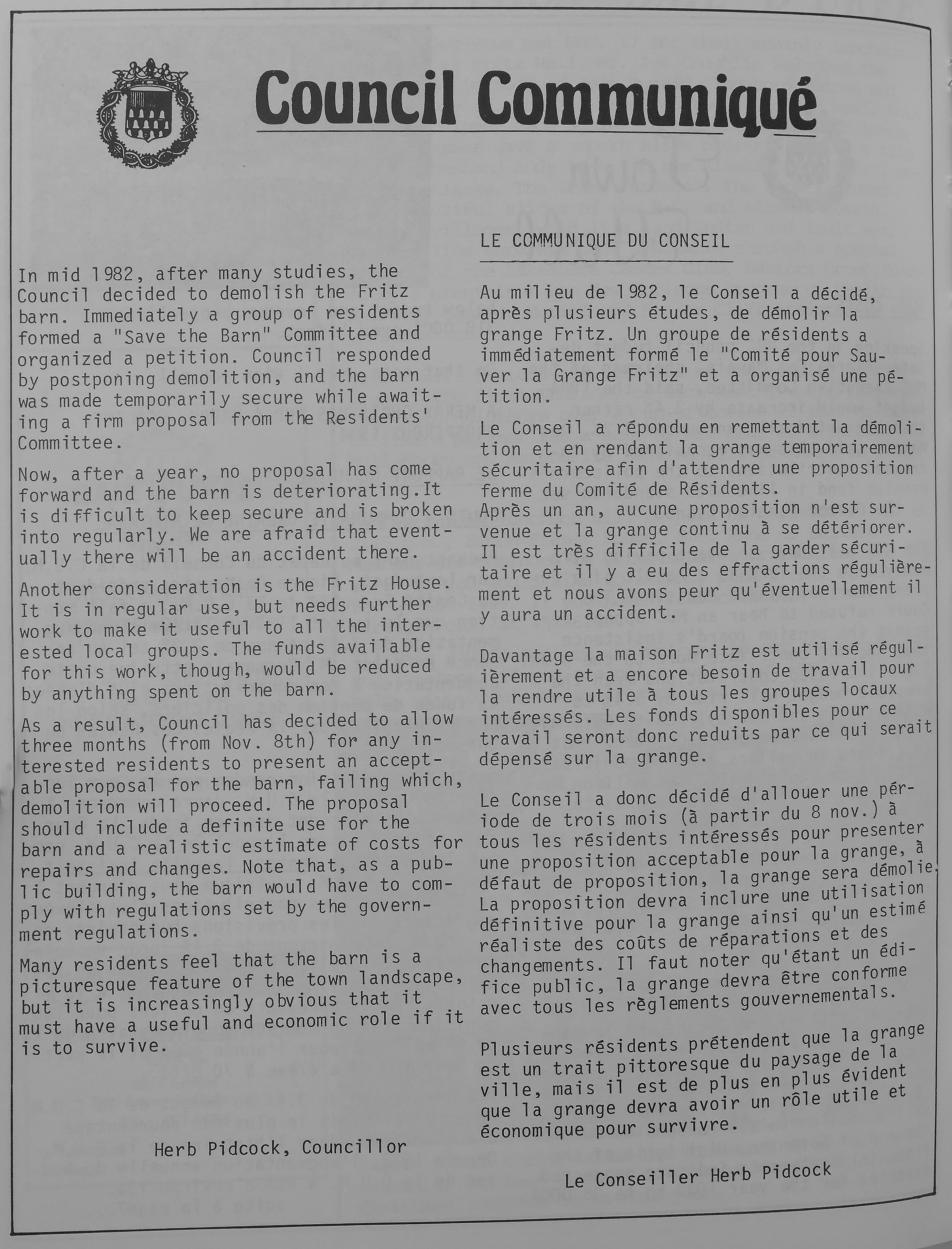 Official opening of the public works building, September 28, 1985, source: N&V Nov 1985, left to right: Fire Chief René Larente, Director of Operations Richard White, Mayor Anne Myles, Captain André Berard