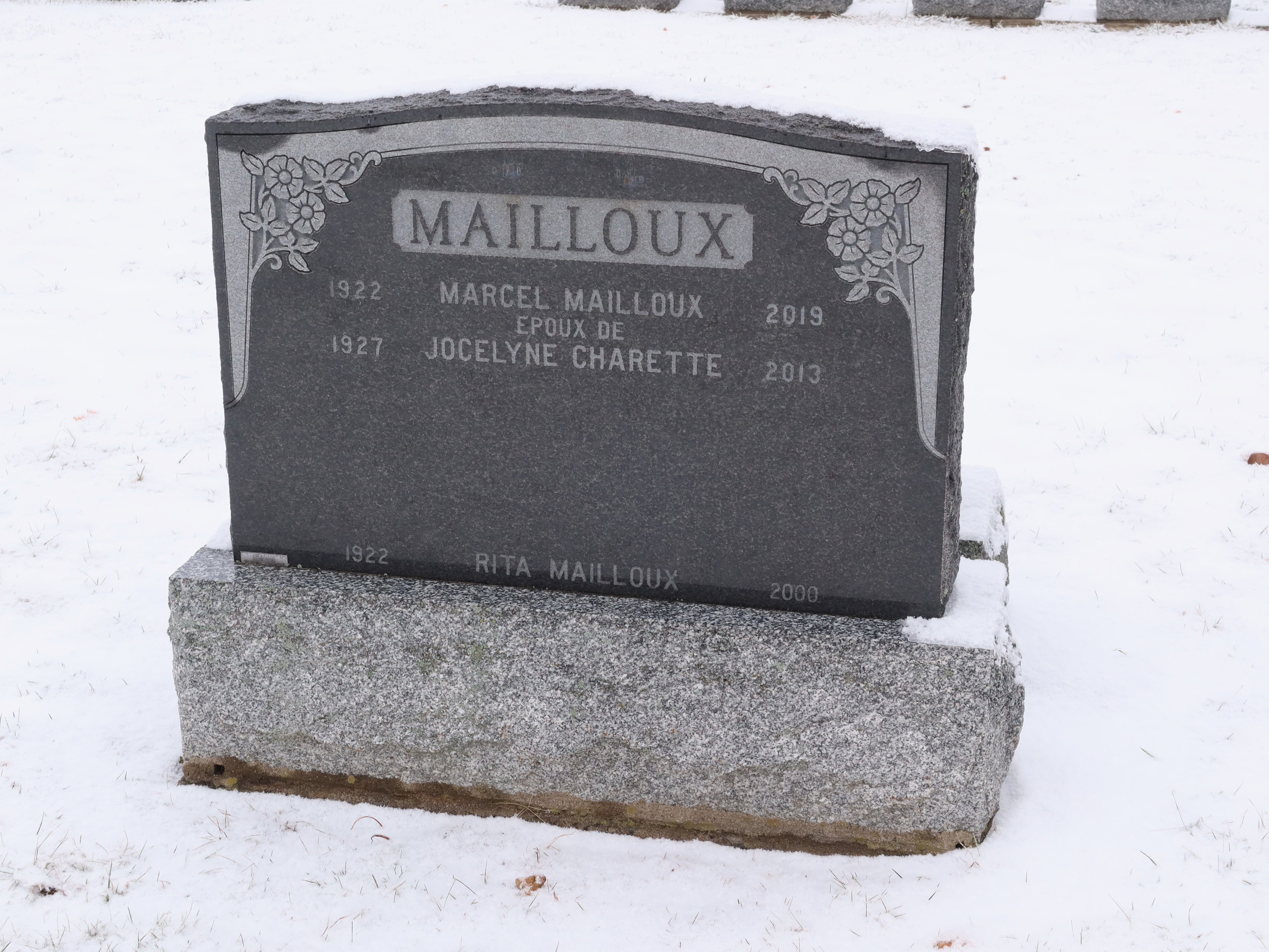Mailloux, St-Anne cemetery, the grave is in the north east area, photo: Jan 2023 Marcel Mailloux (14-Nov-1922 to 12-May-2019) husband of Jocelyne Charette (23-Feb-1927 to 10-Mar-2013)