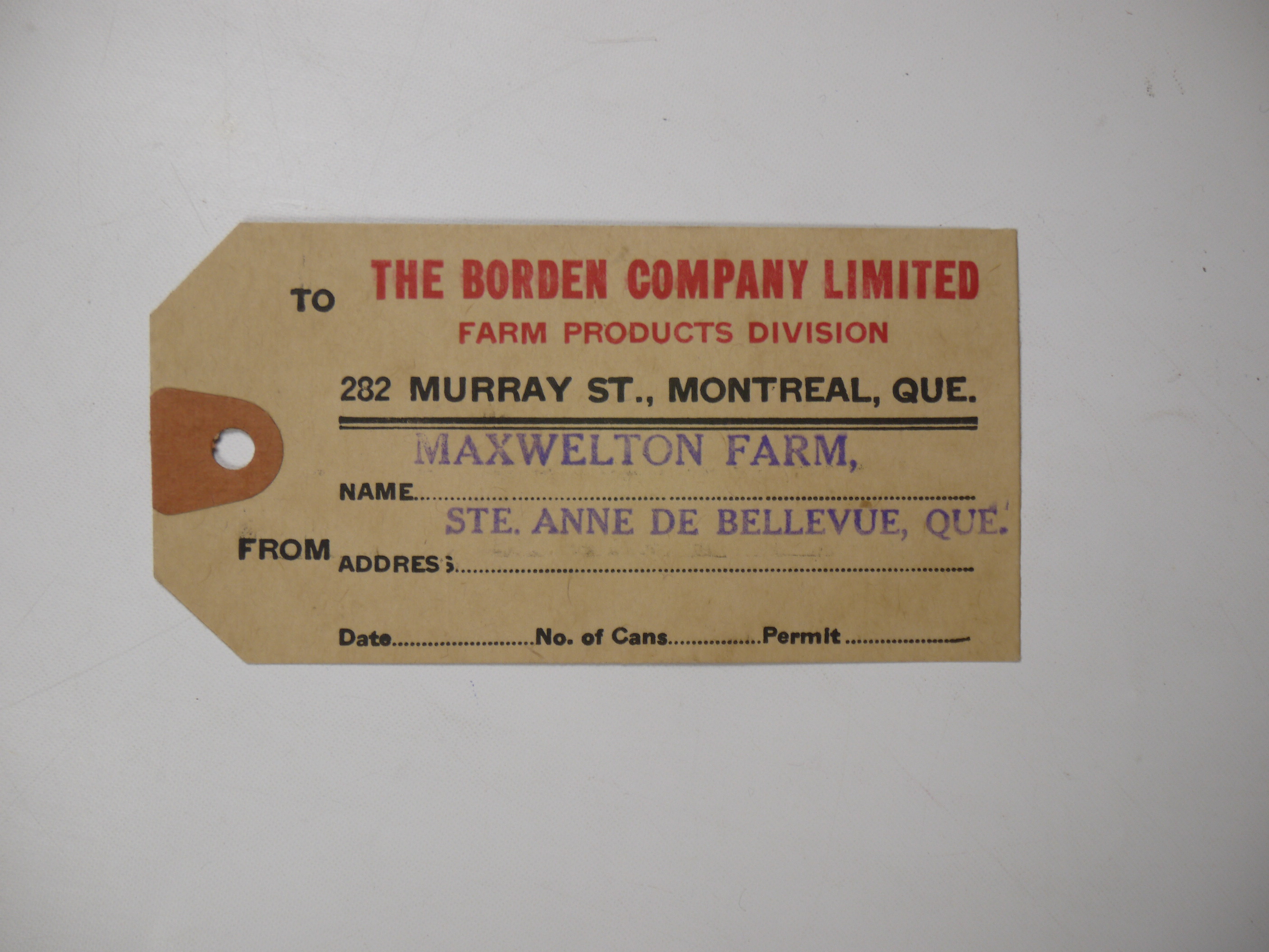 Maxwelton farm delivered their milk by train to Borden Farm Products Canada LTD on Murray Street in Montreal. The company has as their advertisement logo the cow Elsie. The company exists now only in the US with headquarters in Texas (company history from www.bordendairy.com).