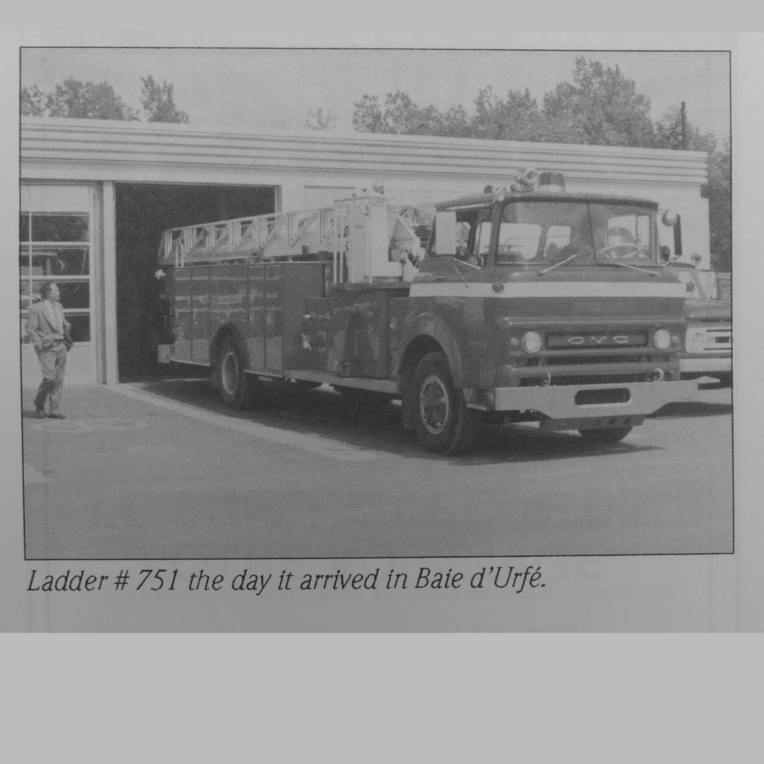 New Baie-D'Urfé fire department ladder truck at 300 Surrey. It's parked in-front of one of the garages in the back of the 300-Surrey building. Source: N&V Dec. 1993