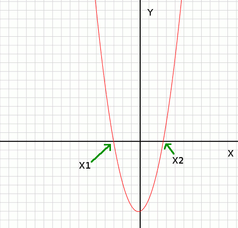 This program finds the points x1 and x2 on the X-axis where the graph y=x2+p*x+q